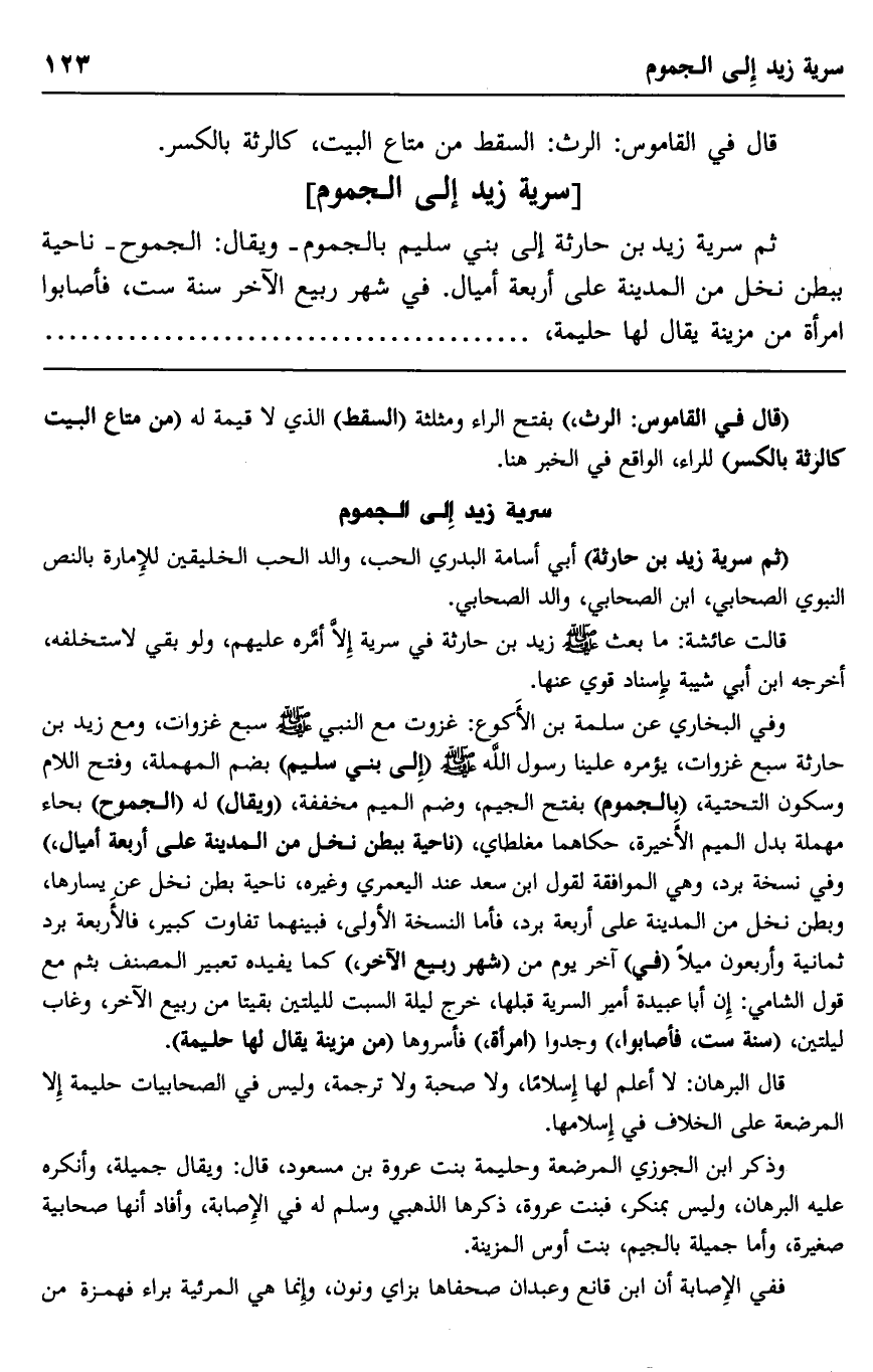 وفي البخاري عن سلمة بن الأكوع: غزوت مع النبي صلى الله عليه وسلم سبع غزوات، ومع زيد بن حارثة سبع غزوات، يؤمره علينا رسول الله صلى الله عليه وسلم "إلى بني سليم" بضم المهملة، وفتح اللام وسكون التحتية، "بالجموم" بفتح الجيم، وضم الميم مخففة، "ويقال" له: "الجموح" بحاء مهملة بدل الميم الأخيرة، حكاهما مغلطاي، "ناحية ببطن نخل من المدينة على أربعة أميال،" وفي نسخة برد، وهي الموافقة لقول ابن سعد عند اليعمري وغيره، ناحية بطن نخل عن يسارها، وبطن نخل من المدينة على أربعة برد، فأما النسخة الأولى، فبينهما تفاوت كبير، فالأربعة برد ثمانية وأربعون ميلا "في" آخر يوم من "شهر ربيع الآخر،" كما يفيده تعبير المصنف بثم مع قول الشامي: إن أبا عبيدة أمير السرية قبلها، خرج ليلة السبت لليلتين بقيتا من ربيع الآخر، وغاب ليلتين، "سنة ست، فأصابوا" وجدوا "امرأة"، فأسروها "من مزينة يقال لها: حليمة".