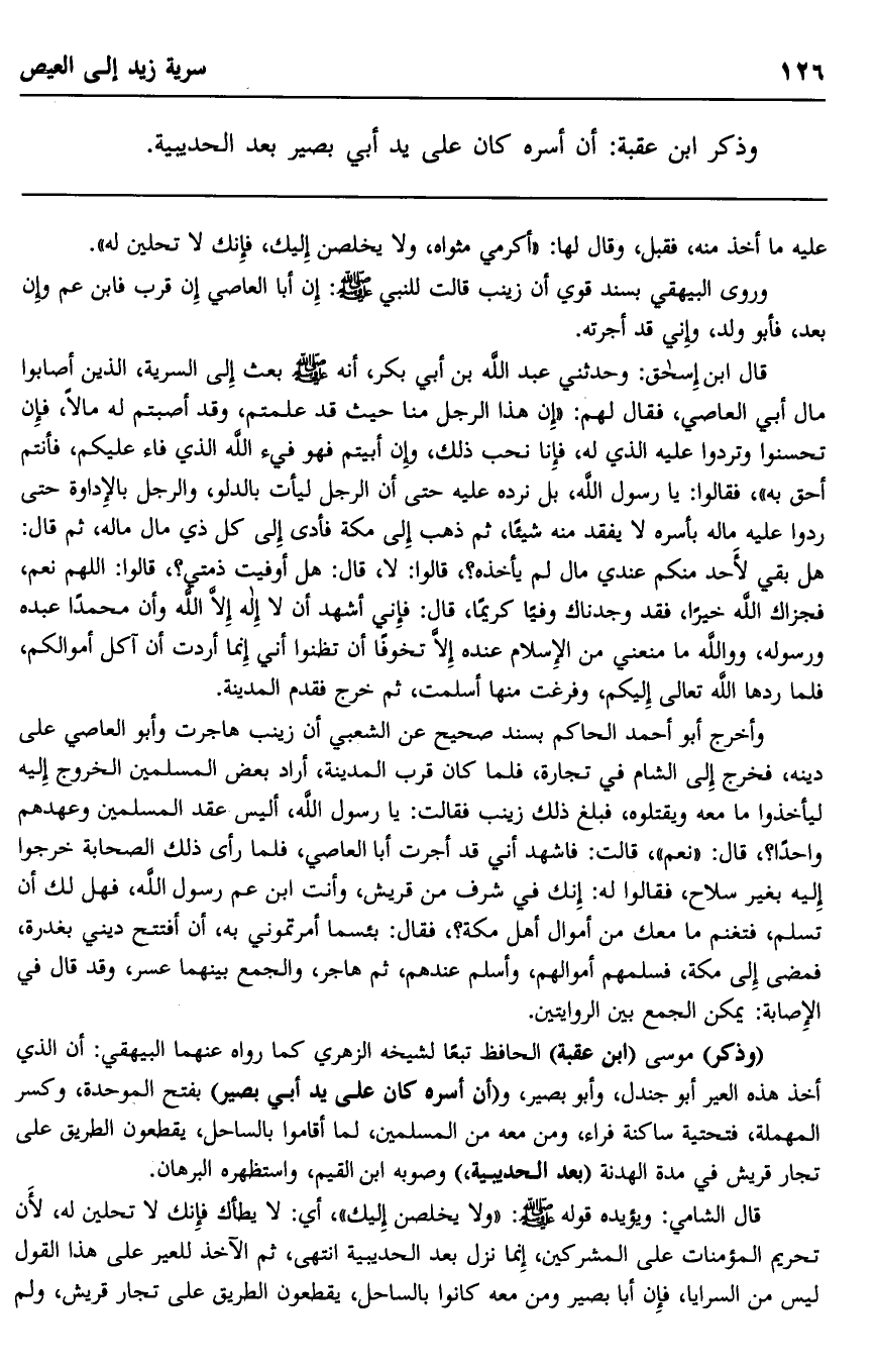 قال الشامي: ويؤيده قوله صلى الله عليه وسلم: "ولا يخلصن إليك"، أي: لا يطأك فإنك لا تحلين له؛ لأن تحريم المؤمنات على المشركين، إنما نزل بعد الحديبية انتهى، ثم الآخذ للعير على هذا القول ليس من السرايا، فإن أبا بصير ومن معه كانوا بالساحل، يقطعون الطريق على تجار قريش، ولم