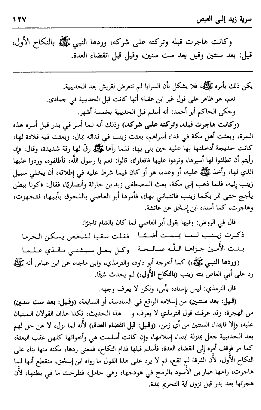 "وكانت هاجرت قبله، وتركته على شركه"، وذلك أنه لما أسر في بدر قبل أسره هذه المرة، وبعثت أهل مكة في فداء أسراهم، بعثت زينب في فدائه بمال، وبعثت فيه قلادة لها، كانت خديجة أدخلتا بها عليه حين بنى بها، فلما رآها صلى الله عليه وسلم رق لها رقة شديدة، وقال: "إن رأيتم أن تطلقوا لها أسيرها، وتردوا عليها فافعلوا"، قالوا: نعم يا رسول الله، فأطلقوه، وردوا عليها الذي لها، وأخذ صلى الله عليه وسلم عليه، أو وعده، هو أو كان فيما شرط عليه في إطلاقه، أن يخلي سبيل زينب إليه، فلما ذهب إلى مكة، بعث المصطفى زيد بن حارثة وأنصاريا، فقال: "كونا ببطن يأجج حتى تمر بكما زينب فائتياني بها"، فأمرها أبو العاصي باللحوق بأبيها، فتجهزت، وهاجرت، كما أسنده ابن إسحاق عن عائشة.