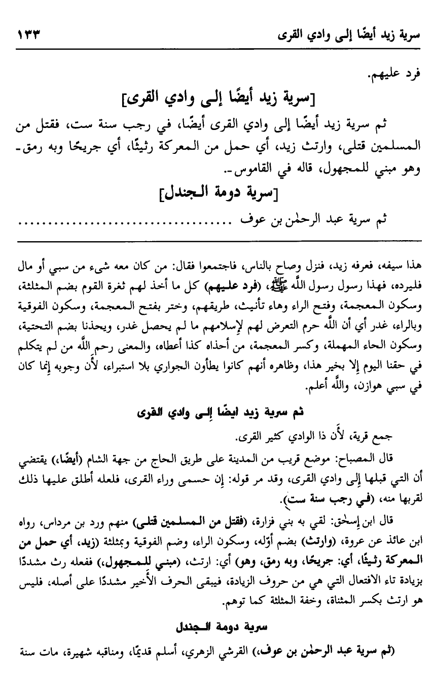 ثم سرية زيد أيضا إلى وادي القرى أيضا، في رجب سنة ست، فقتل من المسلمين قتلى، وارتث زيد، أي حمل من المعركة رثيثا، أي جريحا وبه رمق -وهو مبني للمجهول، قاله في القاموس.