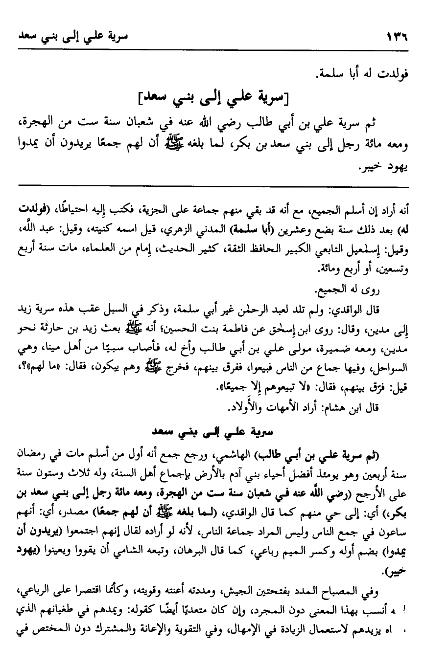 "ثم سرية علي بن أبي طالب" الهاشمي، ورجع جمع أنه أول من أسلم مات في رمضان سنة أربعين، وهو يومئذ أفضل أحياء بني آدم بالأرض بإجماع أهل السنة، وله ثلاث وستون سنة على الأرجح "رضي الله عنه في شعبان سنة ست من الهجرة، ومعه مائة رجل إلى بني سعد بن بكر،" أي: إلى حي منهم كما قال الواقدي، "لما بلغه صلى الله عليه وسلم أن لهم جميعا" مصدر، أي: أنهم ساعون في جمع الناس وليس المراد جماعة الناس؛ لأنه لو أراده لقال: إنهم اجتمعوا "يريدون أن يمدوا" بضم أوله وكسر الميم رباعي، كما قال البرهان، وتبعه الشامي أن يقووا ويعينوا "يهود خيبر".