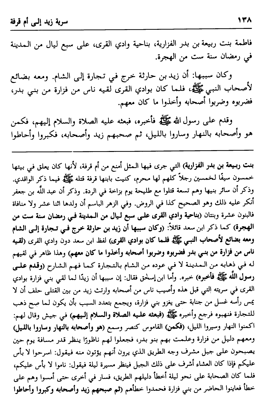 بنت ربيعة بن بدر الفزارية" التي جرى فيها المثل أمنع من أم قرفة؛ لأنها كان يعلق في بيتها خمسون سيفا لخمسين رجلا كلهم لها محرم، كنيت بابنها قرفة قتله صلى الله عليه وسلم فيما ذكر الواقدي، وذكر أن سائر بنيها وهم تسعة قتلوا مع طليحة يوم بزاخة في الردة، وذكر أن عبد الله بن جعفر أنكر عليه ذلك، وهو الصحيح كذا في الروض، وفي الزهر الباسم أن ولدها اثنا عشر ولا منافاة، فالبنون عشرة وبنتان "بناحية وادي القرى على سبع ليال من المدينة في رمضان سنة ست من الهجرة" كما ذكر ابن سعد قائلا: "وكان سببها أن زيد بن حارثة خرج في تجارة إلى الشام، ومعه بضائع لأصحاب النبي صلى الله عليه وسلم، فلما كان بوادي القرى" لفظ ابن سعد دون وادي القرى "لقيه ناس من فزارة من بني بدر، فضربوه وضربوا أصحابه وأخذوا ما كان معهم"، وهذا ظاهر في لقيهم له في ذهابه من المدينة لا في عوده من الشام بالتجارو كما فهم الشارح، "وقدم على رسول الله صلى الله عليه وسلم فأخبره" خبره، وأما ابن إسحاق فقال: إن سببها أن زيدا لما لقي بني فزارة بوادي القرى في سريته التي قبل هذه، وأصيب ناس من أصحابه وارتث زيد من بين القتلى حلف أن لا يمس رأسه غسل من جنابة حتى يغزو بني فزارة، ويجمع بتعدد السبب بأن كون لما صح ذهب للتجارة، فنهبوه فرجع وأخبره صلى الله عليه وسلم، "فبعثه عليه الصلاة والسلام إليهم" في جيش، وقال لهم: اكمنوا النهار وسيروا الليل، "فكمن" القاموس كنصر وسمع "هو وأصحابه بالنهار وساروا بالليل"، ومعهم دليل من فزارة وعلمت بهم بنو بدر، فجعلوا لهن ناظورا ينظر قدر مسافة يوم حين يصبحون على جبل مشرف وجه الطريق الذي يرون أنهم يؤتون منه، فيقول: اسرحوا لا بأس عليكم فإذا كان العشاء أشرف على ذلك الجبل، فينظر مسيرة ليلة فيقول: ناموا لا بأس عليكم، فلما كان الصحابة على نحو ليلة أخطأ دليلهم الطريق، فسار في أخرى حتى أمسوا وهم على خطأ، فعاينوا الحاضر من بني فزارة فحمدوا خطأهم، "ثم صبحهم زيد وأصحابه، وكبروا وأحاطوا