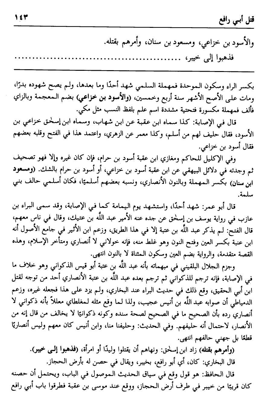 وجزم الجلال البلقيني في مبهماته بأنه عبد الله بن عتبة أبو قيس الذكواني، وهو خلاف ما في الإصابة، فإنه ترجم للذكواني ثم ترجم بعده عبد الله بن عتبة الأنصاري أحد من توجه لقتل ابن أبي الحقيق، وقع ذلك في حديث البراء عند البخاري، ولم يزد على هذا فجعله غيره، وزعم الدمياطي أن صوابه عبد الله بن أنيس عجيب، ولذا لما وقع مثله لمغلطاي معللا بأنه ذكواني لا أنصاري رده بأن الصحيح ما في الصحيح لصحة سنده، وكونه ذكوانيا لا يخالف من قال: إنه من