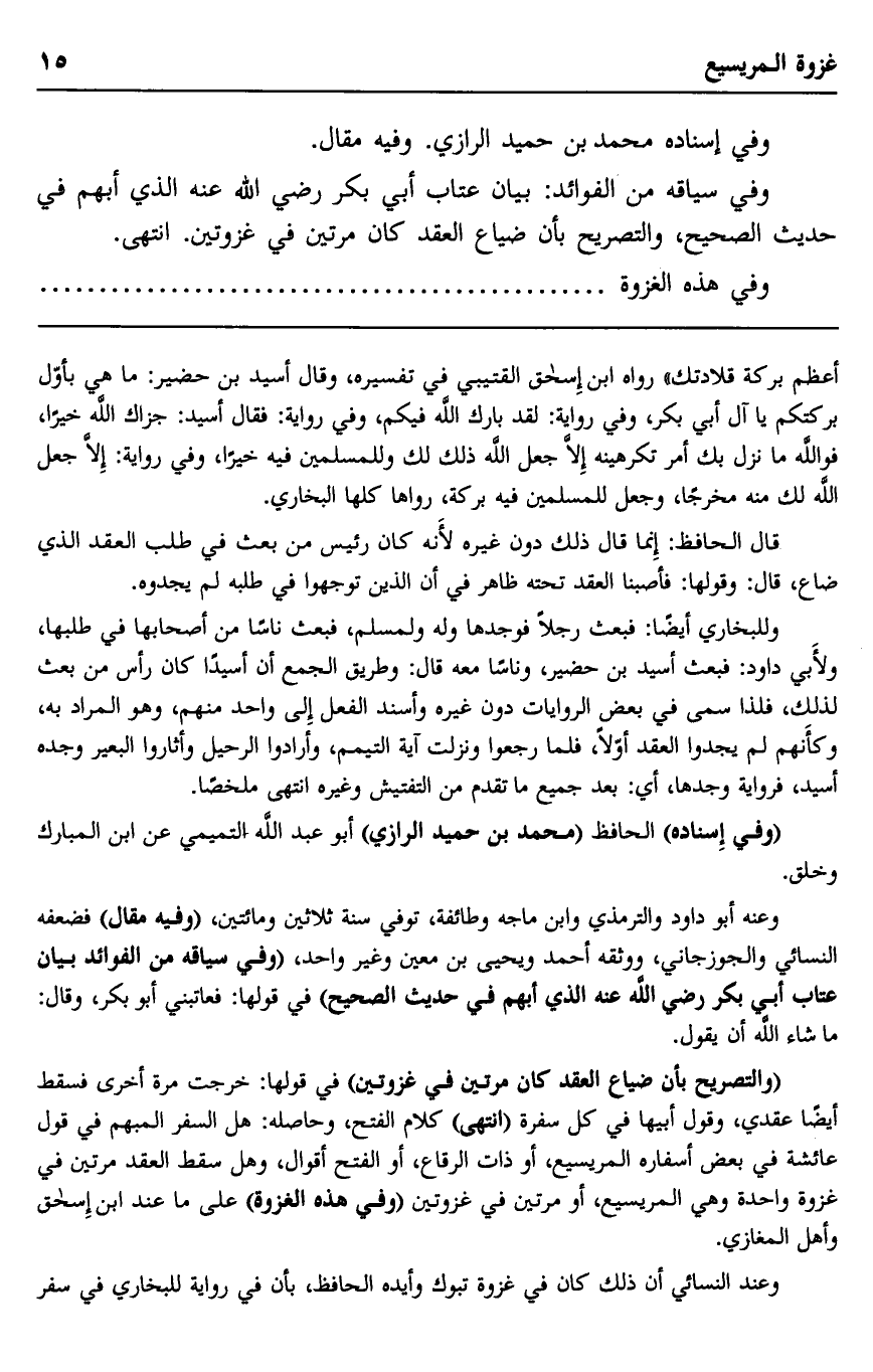 "والتصريح بأن ضياع العقد كان مرتين في غزوتين" في قولها: خرجت مرة أخرى فسقط أيضا عقدي، وقول أبيها في كل سفرة "انتهى" كلام الفتح، وحاصله: هل السفر المبهم في قول عائشة في بعض أسفاره المريسيع، أو ذات الرقاع، أو الفتح أقوال، وهل سقط العقد مرتين في غزوة واحدة وهي المريسيع, أو مرتين في غزوتين "وفي هذه الغزوة" على ما عند ابن إسحاق وأهل المغازي.