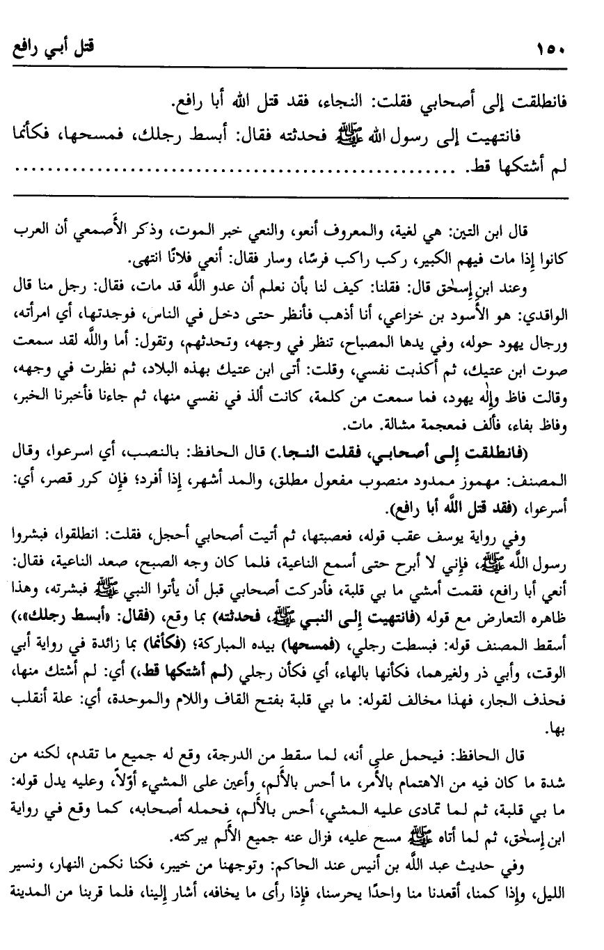 وفي رواية يوسف عقب قوله: فعصبتها، ثم أتيت أصحابي أحجل، فقلت: انطلقوا، فبشروا رسول الله صلى الله عليه وسلم، فإني لا أبرح حتى أسمع الناعية، فلما كان وجه الصبح، صعد الناعية، فقال: أنعي أبا رافع، فقمت أمشي ما بي قلبة، فأدركت أصحابي قبل أن يأتوا النبي صلى الله عليه وسلم فبشرته، وهذ ظاهره التعرض مع قوله "فانتهيت إلى النبي صلى الله عليه وسلم فحدثته" بما وقع، فقال: "ابسط رجلك" , أسقط المصنف قوله: فبسطت رجلي، "فمسحها" بيده المباركة، "فكأنما" بما زائدة في رواية أبي الوقت، وأبي ذر ولغيرهما، فكأنها بالهاء، أي فكأن رجلي "لم أشتكها قط"، أي: لم أشتك منها، فحذف الجار، فهذا مخالف لقوله: ما بي قلبة بفتح القاف واللام والموحدة، أي علة أنقلب بها.