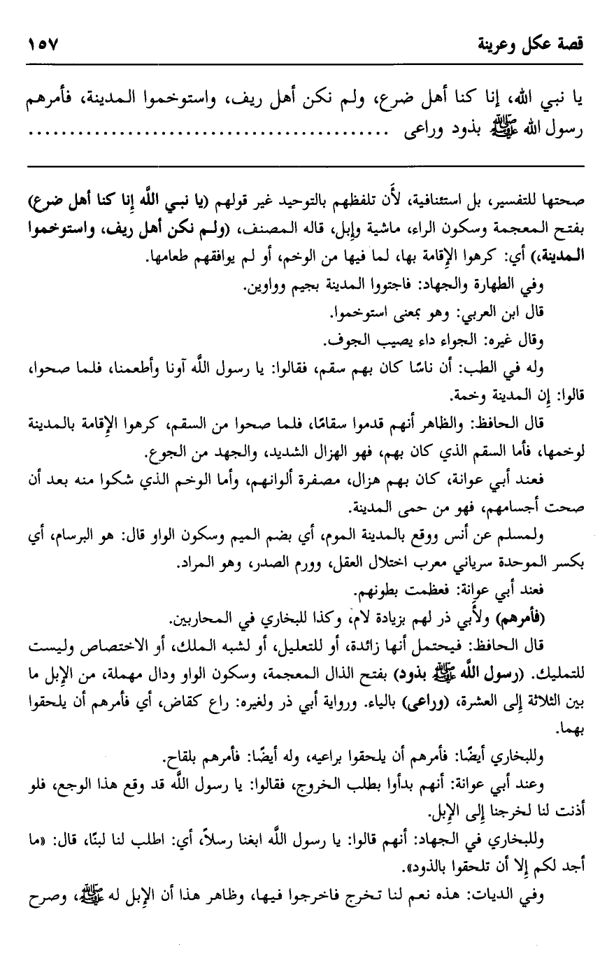 صحتها للتفسير، بل استئنافية، لأن تلفظهم بالتوحيد غير قولهم: "يا نبي الله إن كنا أهل ضرع" بفتح المعجمة وسكون الراء، ماشية وإبل، قال المصنف, "ولم نكن أهل رديف، واستوخموا المدينة" أي: كرهوا الإقامة بها، لما فيها من الوخم، أو لم يوافقهم طعامها.