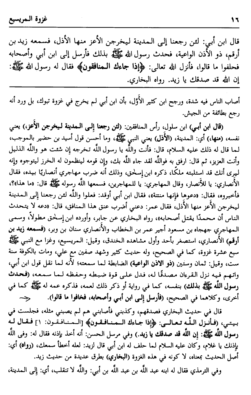 قال ابن أبي: لئن رجعنا إلى المدينة ليخرجن الأعز منها الأذل، فسمعه زيد بن أرقم، ذو الأذن الواعية، فحدث رسول الله صلى الله عليه وسلم بذلك فأرسل إلى ابن أبي وأصحابه فحلفوا ما قالوا، فأنزل الله تعالى: {إِذَا جَاءَكَ الْمُنَافِقُونَ} فقال له رسول الله صلى الله عليه وسلم: "إن الله قد صدقك يا زيد". رواه البخاري.