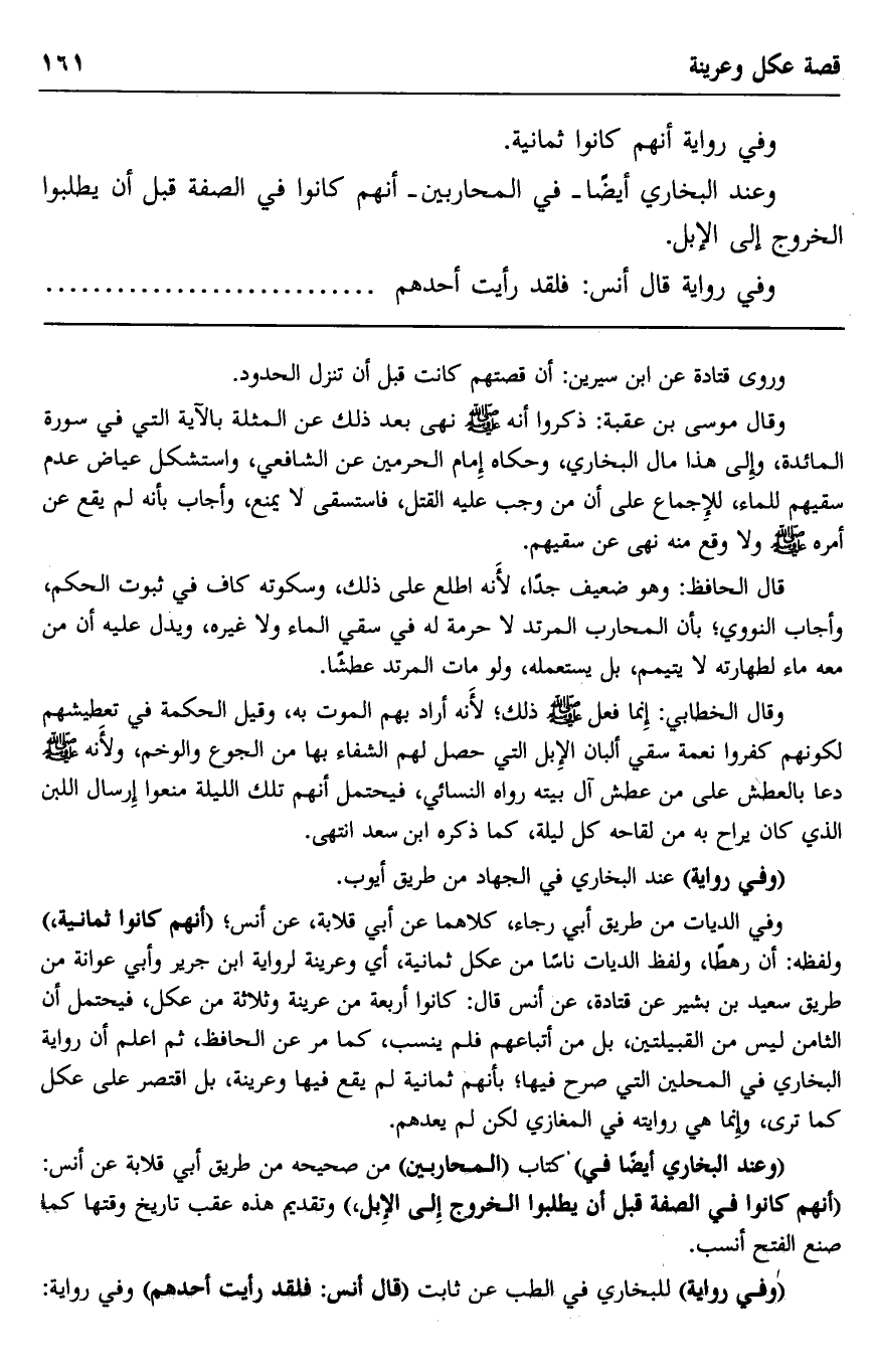 "وعند البخاري أيضا في" كتاب "المحاربين" من صحيحه من طريق أبي قلابة عن أنس: "أنهم كانوا في الصفة قبل أن يطلبوا الخروج إلى الإبل" وتقديم هذه عقب تاريخ وقتها كما صنع الفتح أنسب.