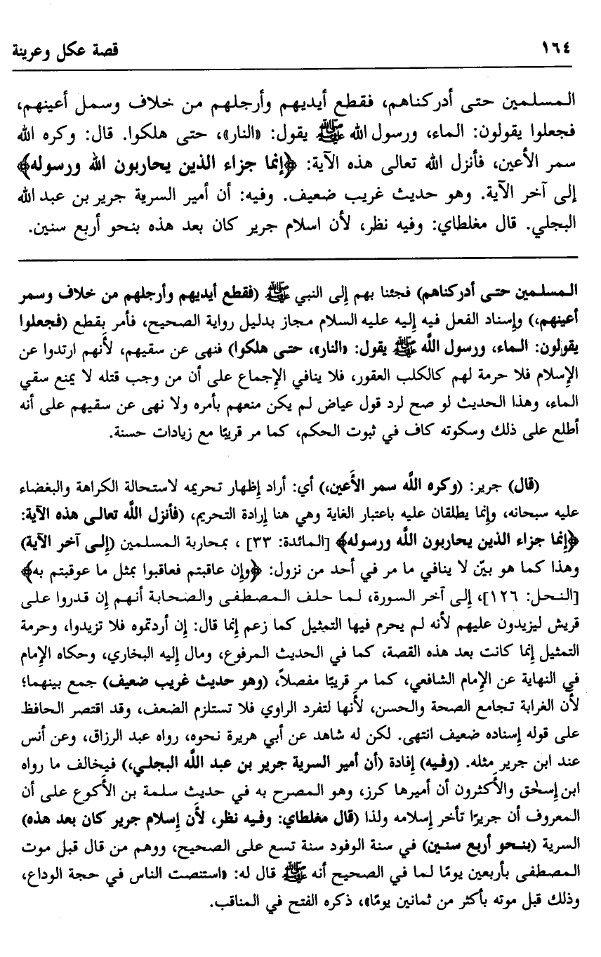 المسلمين حتى أدركناهم، فقطع أيديهم وأرجلهم من خلاف وسمل أعينهم، فجعلوا يقولون: الماء، ورسول الله صلى الله عليه وسلم يقول: "النار"، حتى هلكوا. قال: وكره الله سمر الأعين، فأنزل الله تعالى هذه الآية: {إِنَّمَا جَزَاءُ الَّذِينَ يُحَارِبُونَ اللَّهَ وَرَسُولَهُ} إلى آخر الآية. وهو حديث غريب ضعيف. وفيه: أن أمير السرية جرير بن عبد الله البجلي. قال مغلطاي: وفيه نظر، لأن إسلام جرير كان بعد هذه بنحو أربع سنين.