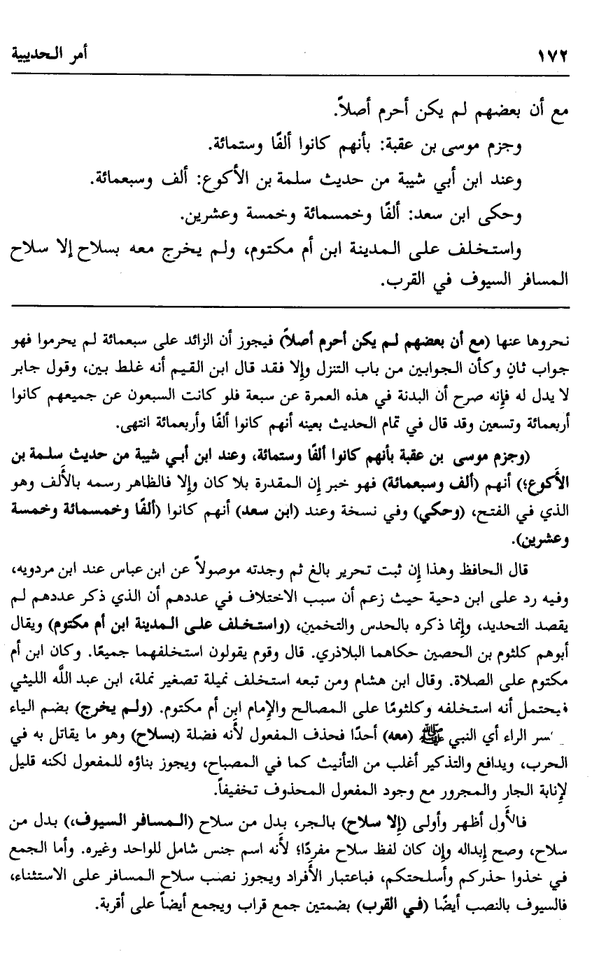 "وجزم موسى بن عقبة بأنهم كانوا ألفا وستمائة، وعند ابن أبي شيبة من حديث سلمة بن الأكوع"، أنهم "ألف وسبعمائة" فهو خبر إن المقدرة بلا كان وإلا فالظاهر رسمه بالألف وهو الذي في الفتح، "وحكى" وفي نسخة وعند "ابن سعد" أنهم كانوا "ألفا وخمسمائة وخمسة وعشرين".
