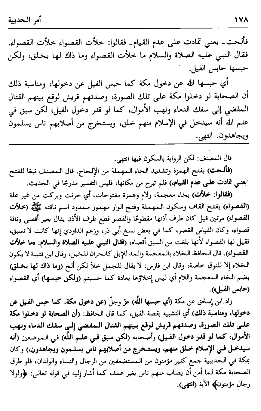 فألحت -يعني تمادت على عدم القيام- فقالوا: خلأت القصواء خلأت القصواء. فقال النبي عليه الصلاة والسلام: "ما خلأت القصواء وما ذاك لها بخلق، ولكن حبسها حابس الفيل".