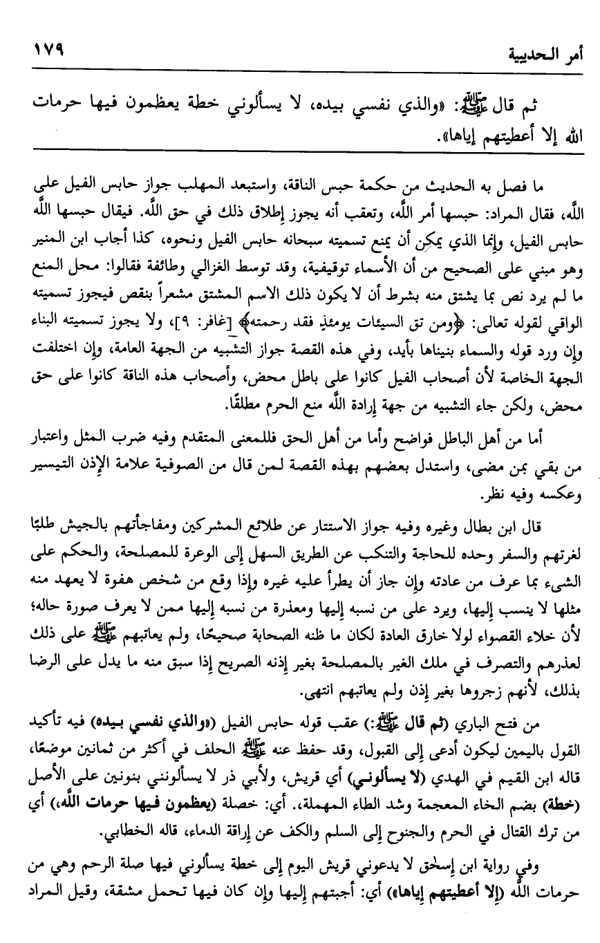 ما فصل به الحديث من حكمة حبس الناقة، واستبعد المهلب جواز حابس الفيل على الله، فقال المراد: حبسه أمر الله، وتعقب أنه يجوز إطلاق ذلك في حق الله. فيقال حبسها الله حابس الفيل، وإنما الذي يمكن أن يمنع تسميته سبحانه حابس الفيل ونحوه، كذا أجاب ابن المنير وهو مبني على الصحيح من أن الأسماء توقيفية، وقد توسط الغزالي وطائفة فقالوا: محل المنع ما لم يرد نص بما يشتق منه بشرط أن لا يكون ذلك الاسم المشتق مشعرا بنقص فيجوز تسميته الواقي لقوله تعالى: {وَمَنْ تَقِ السَّيِّئَاتِ يَوْمَئِذٍ فَقَدْ رَحِمْتَهُ} [غافر: 9] ، ولا يجوز تسميته البناء وإن ورد قوله: {وَالسَّمَاءَ بَنَيْنَاهَا بِأَيْدٍ} ، وفي هذه القصة جواز التشبيه من الجهة العامة، وإن اختلفت الجهة الخاصة لأن أصحاب الفيل كانوا على باطل محض، وأصحاب هذه الناقة كانوا على حق محض، ولكن جاء التشبيه من جهة إرادة الله منع الحرم مطلقا.