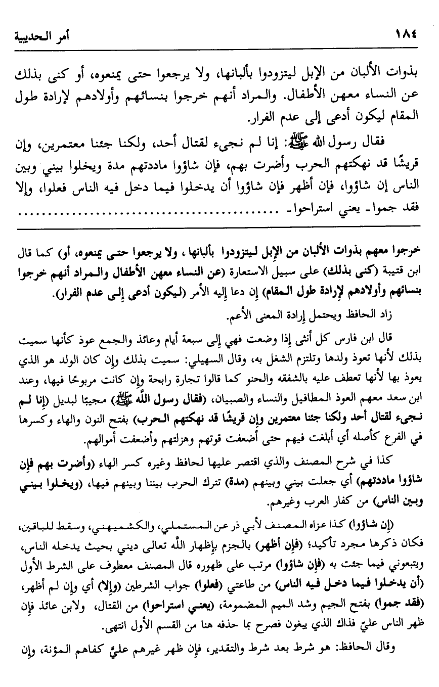 فقال رسول الله صلى الله عليه وسلم: "إنا لم نجئ لقتال أحد، ولكن جئنا معتمرين، وإن قريشا قد نهكتهم الحرب وأضرت بهم، فإن شاءوا ماددتهم مدة ويخلوا بيني وبين الناس إن شاءوا، فإن أظهر فإن شاءوا أن يدخلوا فيما دخل فيه الناس فعلوا، وإلا فقد جمعوا -يعني استراحوا