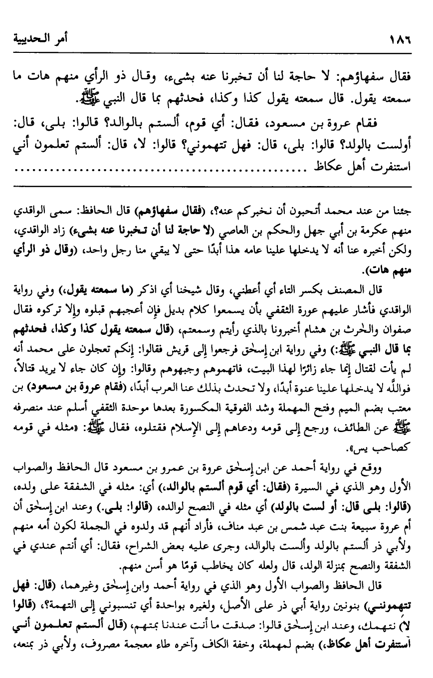 فقام عروة بن مسعود، فقال: أي قوم، ألستم بالوالد؟ قالوا: بلى، قال: أو لست بالولد؟ قالوا: بلى، قال: فهل تتهموني؟ قالوا: لا، قال: ألستم تعلمون أني استنفرت أهل عكاظ