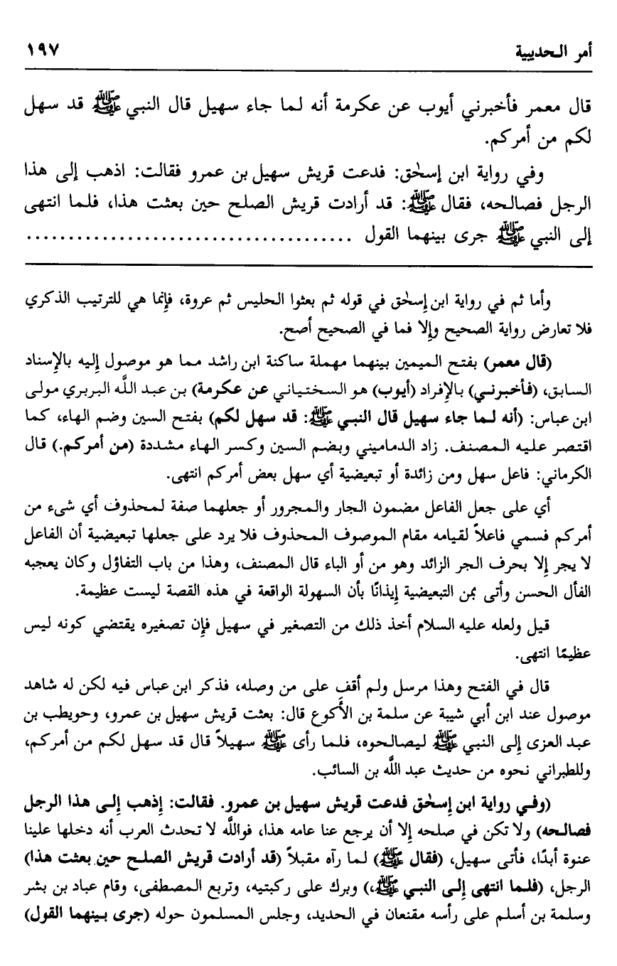 قال معمر: فأخبرني أيوب عن عكرمة أنه لما جاء سهيل قال النبي صلى الله عليه وسلم: "قد سهل لكم من أمركم".