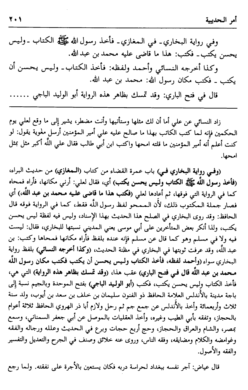 "وفي رواية البخاري في" باب عمرة القضاء من كتاب "المغازي" من حديث البراء، "فأخذ رسول الله صلى الله عليه وسلم الكتاب وليس يحسن يكتب" أي، فقال لعلي: "أرني مكانها". فأراه فمحاه كما في الرواية التي فوقها، ثم أعادها لعلي "فكتب هذا ما قاضى عليه محمد بن عبد الله،" أي: فصار جملة المكتوب ذلك، لأن الممحو لفظ رسول الله فقط، كما في الرواية فوقه قال الحافظ: وقد روى البخاري في الصلح هذا الحديث بهذا الإسناد، وليس فيه لفظة: ليس يحسن يكتب، ولذا أنكر بعض المتأخرين علي بن موسى يعني المديني نسبتها للبخاري، فقال: ليست فيه ولا في مسلم وهو كما قال عن مسلم فإنه عنده بلفظ فأراه مكانها فمحاها وكتب: ابن عبد الله، وقد عرفت ثوبتها في البخاري في مظنة الحديث، "وكذا أخرجه النسائي" بلفظ رواية البخاري سواء "وأحمد لفظه، فأخذ الكتاب وليس يحسن أن يكتب فكتب مكان رسول الله محمد بن عبد الله قال في فتح الباري" عقب هذا: "وقد تمسك بظاهر هذه الرواية" التي هي: فأخذ الكتاب وليس يحسن يكتب، فكتب "أبو الوليد الباجي" بفتح الموحدة وبالجيم نسبة إلى باجة مدينة بالأندلس العلامة الحافظ ذو الفنون سليمان بن خلف بن سعد بن أيوب، ولد سنة ثلاث وأربعمائة وأخذ بالأندلس عن جمع ج ثم رحل ولازم أبا ذر الهروي الحافظ ثلاثة أعوام بالحجاز، وتفقه بأبي الطيب وغيره، وأخذ العقليات بالموصل عن أبي جعفر السمناني، وسمع بمصر، والشام والعراق والحجاز، وحج أربع حجات وبرع في الحديث وعلله ورجاله والفقه وغوامضه والكلام ومضايقه، وفقه الناس، وروى عنه خلائق وصنف في الجرح والتعديل والتفسير والفقه والأصول.