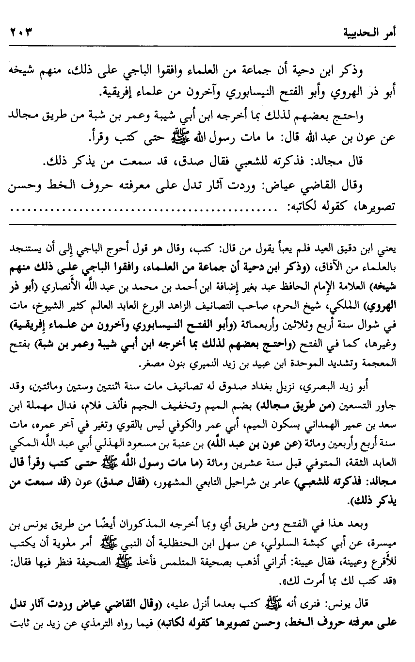 أبو زيد البصري، نزيل بغداد صدوق له تصانيف مات سنة اثنتين وستين ومائتين، وقد جاور التسعين "من طريق مجالد" بضم الميم وتخفيف الجيم فألف فلام، فدال مهملة ابن سعد بن عمير الهمداني بسكون الميم، أبي عمر والكوفي ليس بالقوي وتغير في آخر عمره، مات سنة أربع وأربعين ومائة "عن عون بن عبد الله" بن عتبة بن مسعد الهذلي أبي عبد الله المكي العابد الثقة، المتوفى قبل سنة عشرين ومائة "ما مات رسول الله صلى الله عليه وسلم حتى كتب وقرأ قال مجالد: فذكرته للشعبي" عامر بن شراحيل التابعي المشهور، "فقال: صدق" عون "قد سمعت من يذكر ذلك".