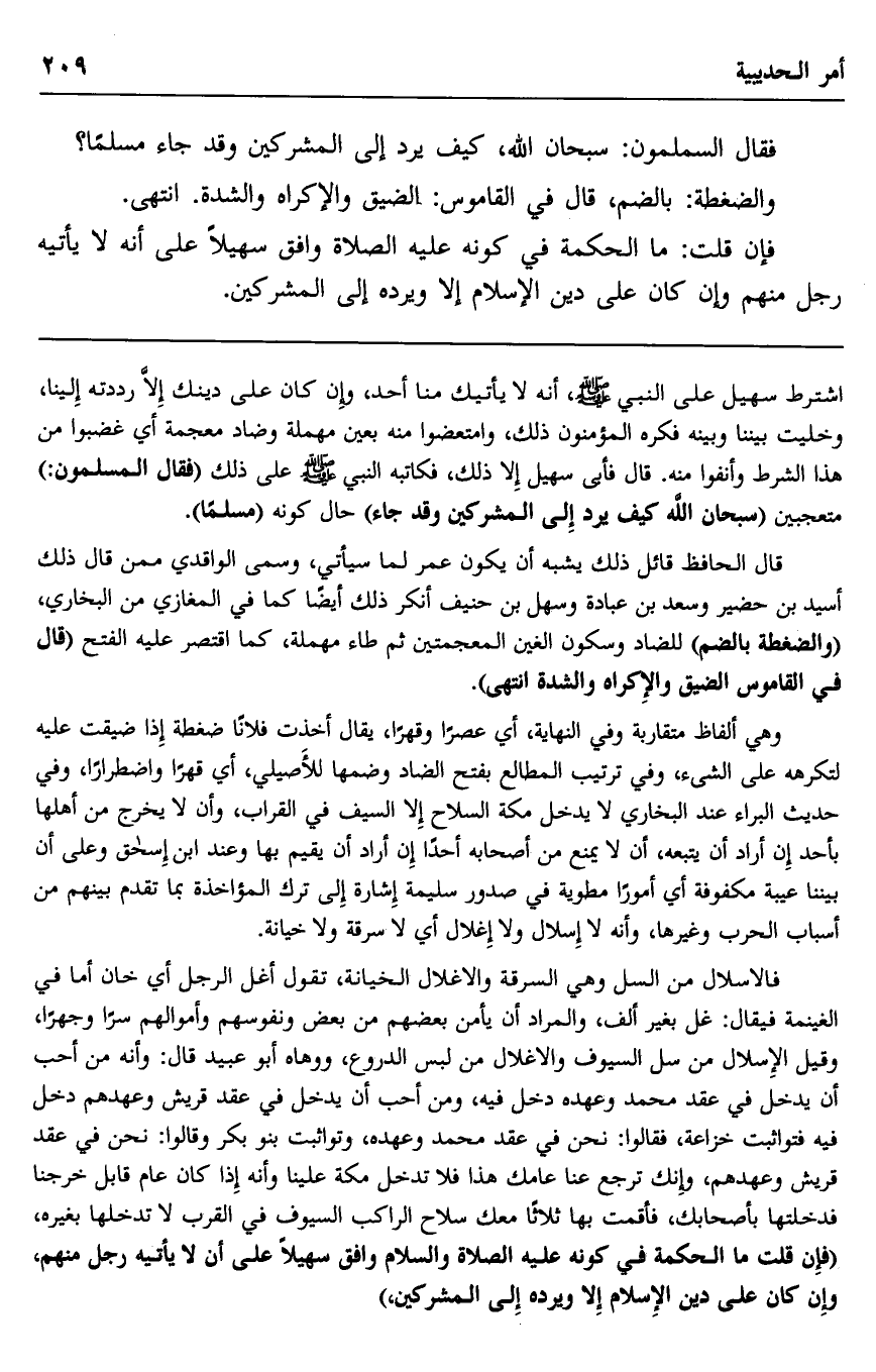 وهي ألفاظ متقاربة وفي النهاية، أي عصرا وقهرا، يقال: أخذت فلانا ضغطة إذا ضيقت عليه لتكرهه على الشيء، وفي ترتيب المطالع بفتح الضاد وضمها للأصيلي، أي قهرا واضطرارا، وفي حديث البراء عند البخاري لا يدخل مكة السلاح إلا السيف في القراب، وأن لا يخرج من أهلها بأحد إن أراد أن يتبعه، أن لا يمنع من أصحابه أحدا إن أراد أن يقيم بها وعند ابن إسحاق: وعلى أن بيننا عيبة مكفوفة أي أمورا مطوية في صدور سليمة إشارة إلى ترك المؤاخذة بما تقدم بينهم من أسباب الحرب وغيرها، وأنه لا إسلال ولا إغلال أي لا سرقة ولا خيانة.