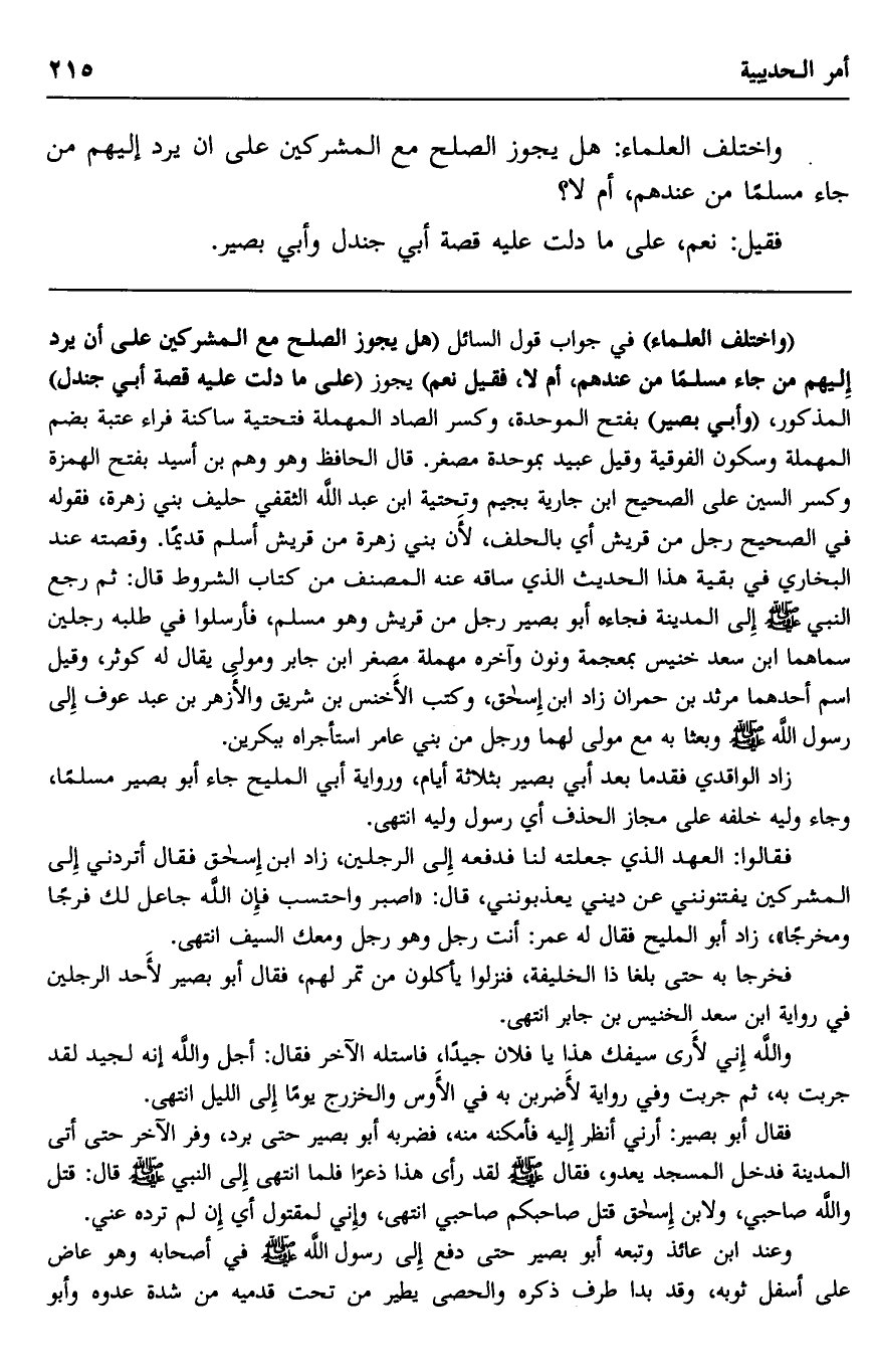 "واختلف العلماء" في جواب قول السائل "هل يجوز الصلح مع المشركين على أن يرد إليهم من جاء مسلما من عندهم، أم لا، فقيل: نعم" يجوز "على ما دلت عليه قصة أبي جندل" المذكور، "وأبي بصير" بفتح الموحدة، وكسر الصاد المهملة فتحتية ساكنة فراء عتبة بضم المهملة وسكون الفوقية وقيل عبيد بموحدة مصغر. قال الحافظ وهو وهم بن أسيد بفتح الهمزة وكسر السين على الصحيح ابن جارية بجيم وتحتية ابن عبد الله الثقفي حليف بني زهرة، فقوله في الصحيح رجل من قريش أي بالحلف؛ لأن بني زهرة من قريش, أسلم قديما. وقصته عند البخاري في بقية هذا الحديث الذي ساقه عنه المصنف من كتاب الشروط قال: ثم رجع النبي صلى الله عليه وسلم إلى المدينة فجاءه أبو بصير رجل من قريش وهو مسلم، فأرسلوا في طلبه رجلين سماهما ابن سعد خنيس بمعجمة ونون وآخره مهملة مصغر ابن جابر ومولى يقال له كوثر، وقيل اسم أحدهما مرثد بن حمران بن إسحاق، وكتب الأخنس بن شريق والأزهر بن عبد عوف إلى رسول الله صلى الله عليه وسلم وبعثا به مع مولى لهما ورجل من بني عامر استأجراه ببكرين.