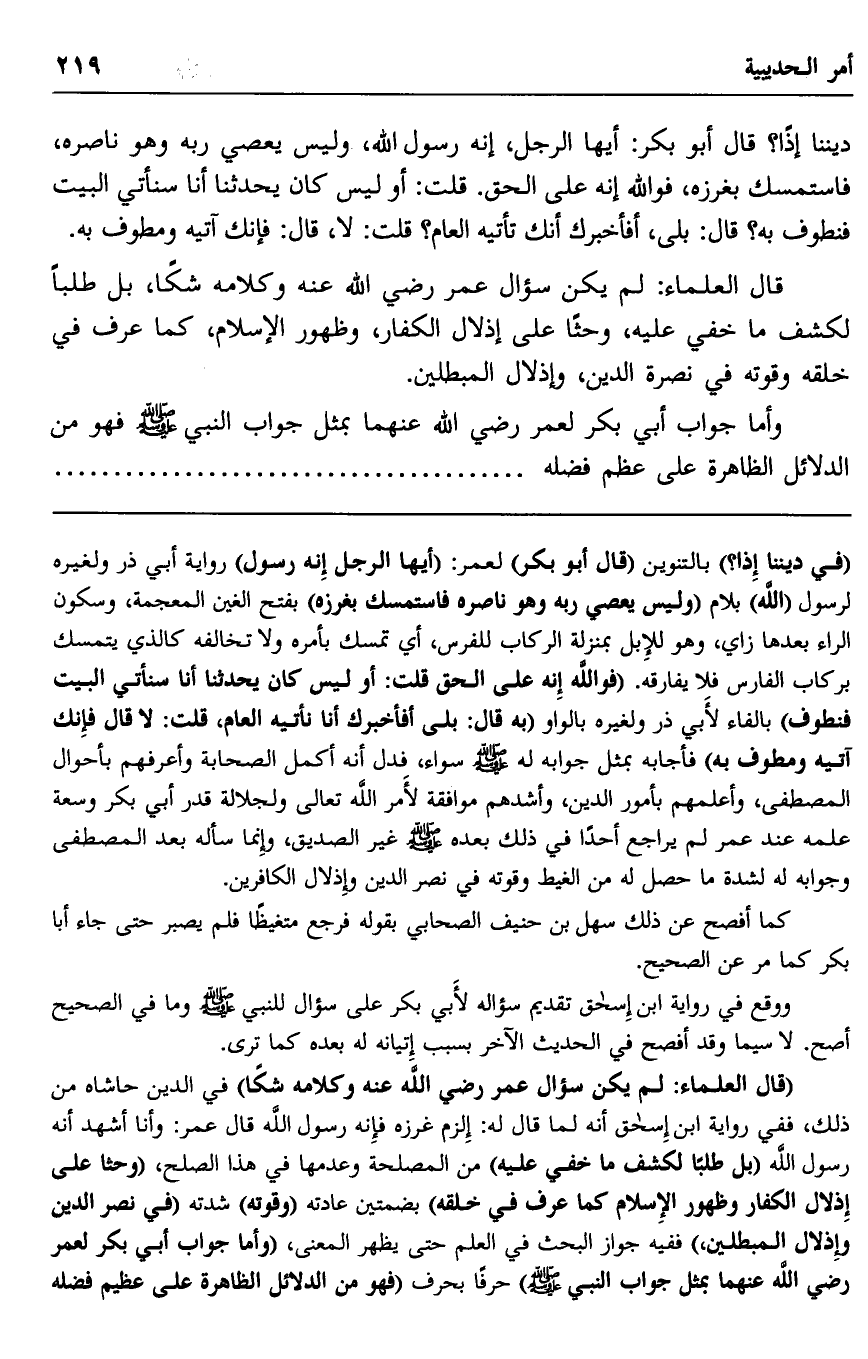 ديننا إذا؟ قال أبو بكر: أيها الرجل، إنه رسول الله، وليس يعصي ربه وهو ناصره، فاستمسك بغرزه، فوالله إنه على الحق. قلت: أو ليس كان يحدثنا أنا سنأتي البيت فنطوف به؟ قال: بلى، أفأخبرك أنك تأتيه العام؟ قلت: لا، قال: فإنك آتيه ومطوف به.