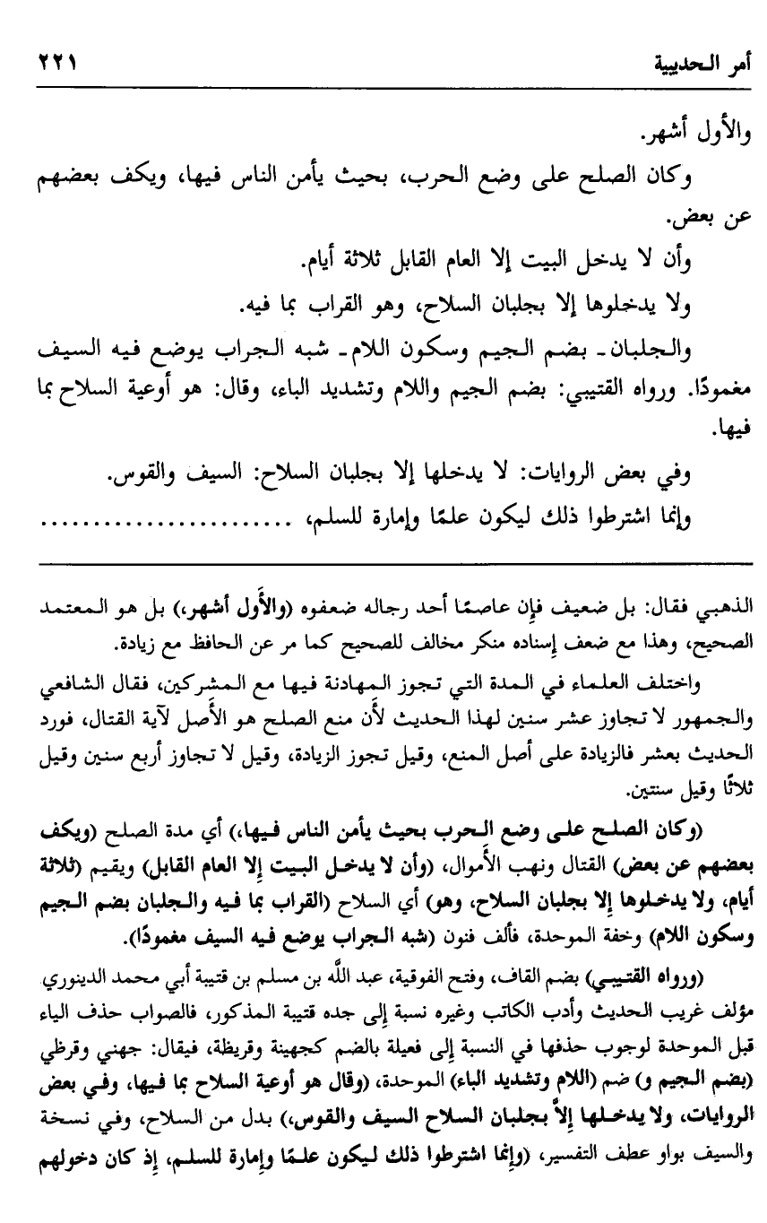 "وكان الصلح على وضع الحرب بحيث يأمن الناس فيها" أي مدة الصلح "ويكف بعضهم عن بعض" القتال ونهب الأموال، "وأن لا يدخل البيت إلا العام القابل" ويقيم "ثلاثة أيام، ولا يدخلوها إلا بجلبان السلاح، وهو" أي السلاح "القراب بما فيه والجلبان بضم الجيم وسكون الجيم" وخفة الموحدة، فألف فنون "شبه الجراب يوضع فيه السيف مغمودا".