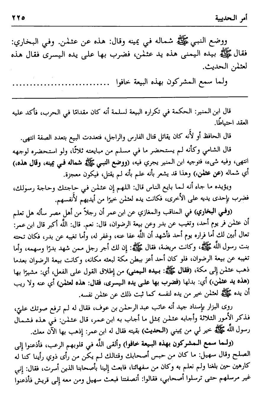 ووضع النبي صلى الله عليه وسلم شماله في يمينه وقال: "هذه عن عثمان". وفي البخاري: فقال صلى الله عليه وسلم بيده اليمنى: "هذه يد عثمان". فضرب بها على يده اليسرى فقال: "هذه لعثمان" ... الحديث.