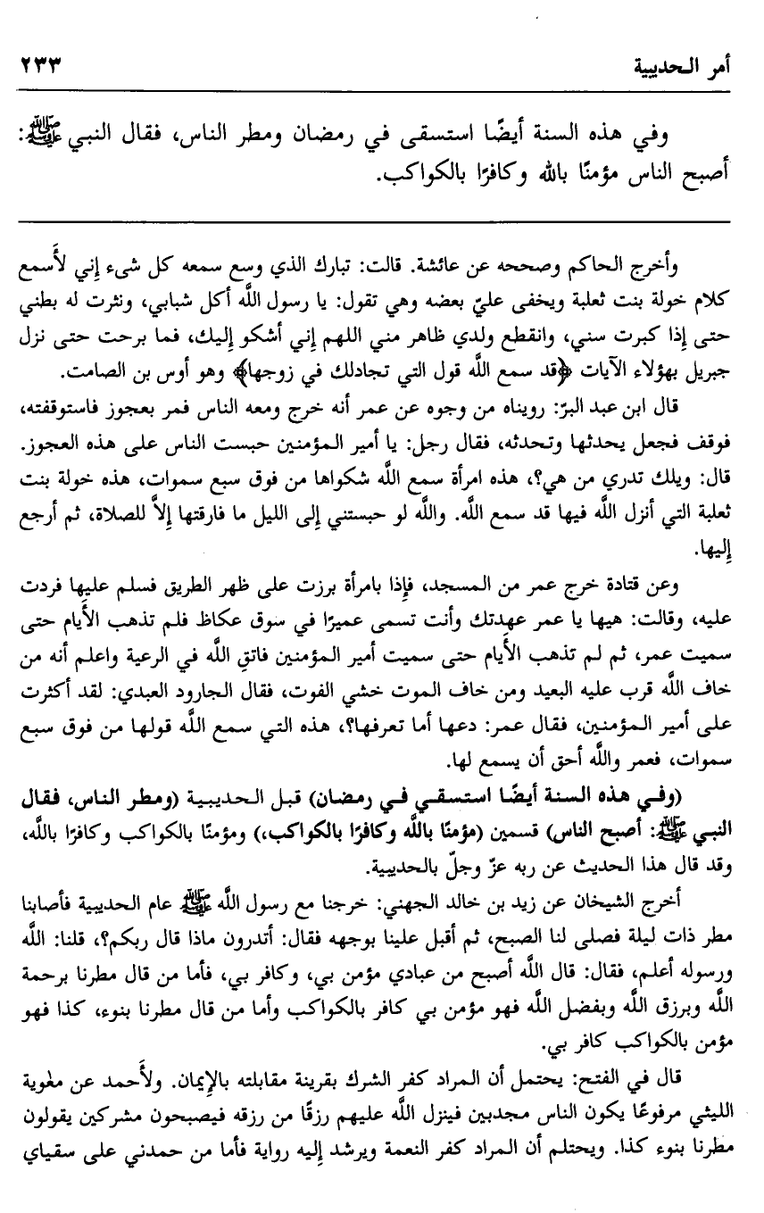 "وفي هذه السنة أيضا استسقى في رمضان" قبل الحديبية "ومطر الناس"، فقال النبي صلى الله عليه وسلم: "أصبح الناس" قسمين "مؤمنا بالله وكافرا بالكواكب" , ومؤمنا بالكواكب وكافرا بالله، وقد قال هذا الحديث عن ربه عز وجل بالحديبية.