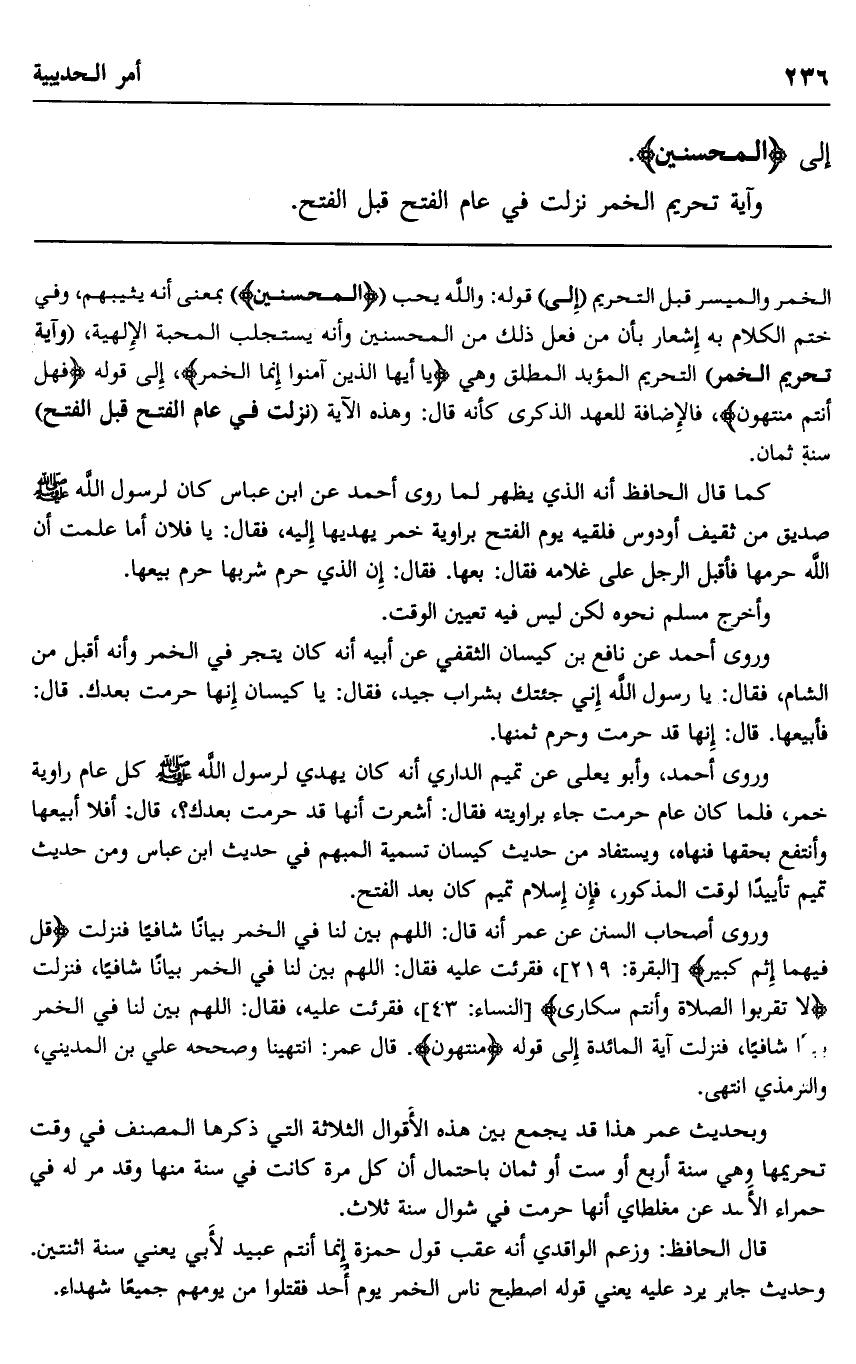 وروى أصحاب السنن عن عمر أنه قال: اللهم بين لنا في الخمر بيانا شافيا, فنزلت: {قُلْ فِيهِمَا إِثْمٌ كَبِيرٌ} [البقرة: 219] ، فقرئت عليه, فقال: اللهم بين لنا في الخمر بيانا شافيا، فنزلت: {لَا تَقْرَبُوا الصَّلَاةَ وَأَنْتُمْ سُكَارَى} [النساء: 43] ، فقرئت عليه، فقال: اللهم بين لنا في الخمر بيانا شافيا، فنزلت آية المائة إلى قوله: {مُنْتَهُونَ} قال عمر: انتهينا وصححه علي بن المديني، والترمذي. انتهى.