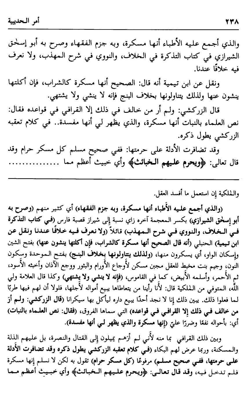 وبين ذلك القرافي بما منه لأني لم أرهم يميلون إلى القتال والنصرة، بل عليهم الذلة والمسكنة، وربما عرض لهم البكاء "في كلام تعقبه الزركشي يطول ذكره وقد تضافرت الأدلة على حرمتها، ففي صحيح مسلم" مرفوعا: "كل مسكر حرام" تقول به لكن لا نسلم أنها مسكرة فلم تدخل فيه، وقد قال تعالى: {وَيُحَرِّمُ عَلَيْهِمُ الْخَبَائِثَ} وأي خبيث أعظم مما