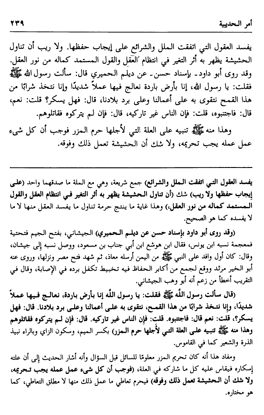 يفسد العقول التي اتفقت الملل والشرائع على إيجاب حفظها. ولا ريب أن تناول الحشيشة يظهر به أثر التغير في انتظام العقل والقول المستمد كماله من نور العقل. وقد روى أبو داود -بإسناد حسن- عن ديلم الحميري قال: سألت رسول الله صلى الله عليه وسلم فقلت: يا رسول الله! إنا بأرض باردة نعالج فيها عملا شديدا وإنا نتخذ شرابا من هذا القمح نتقوى به على أعمالنا وعلى برد بلادنا، قال: "فهل يسكر"؟ , قلت: نعم، قال: "فاجتنبوه"، قلت: فإن الناس غير تاركيه، قال: "فإن لم يتركوه فقاتلوهم".