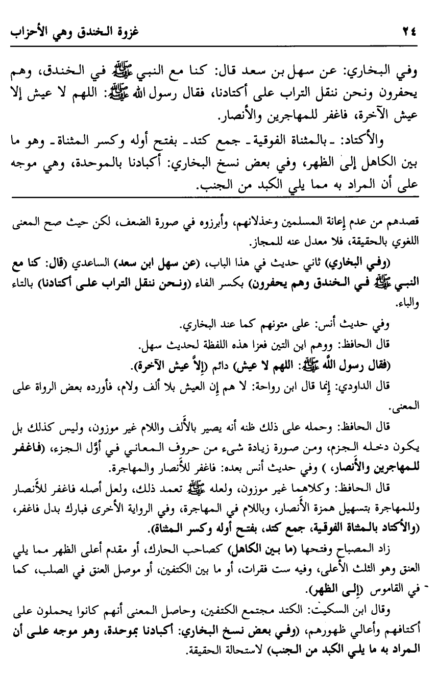 قال الحافظ: وكلاهما غير موزون، ولعله صلى الله عليه وسلم تعمد ذلك، ولعل أصله فاغفر للأنصار وللمهاجرة بتسهيل همزة الأنصار، وباللام في المهاجرة، وفي الرواية الأخرى فبارك بدل فاغفر، "والأكتاد بالمثناة الفوقية، جمع كتد، بفتح أوله وكسر المثناة".