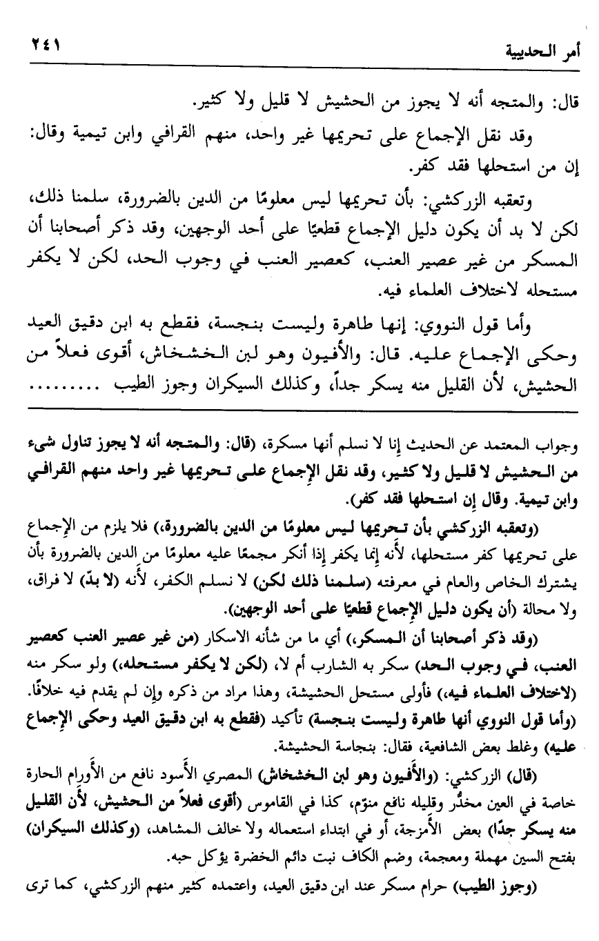 وجواب المعتمد عن الحديث: إنا لا نسلم أنها مسكرة، "قال: والمتجه أنه لا يجوز تناول شيء من الحشيش لا قليل ولا كثير، وقد نقل الإجماع على تحريمها غير واحد منهم القرافي وابن تيمية. وقال: إن استحلها فقد كفر".
