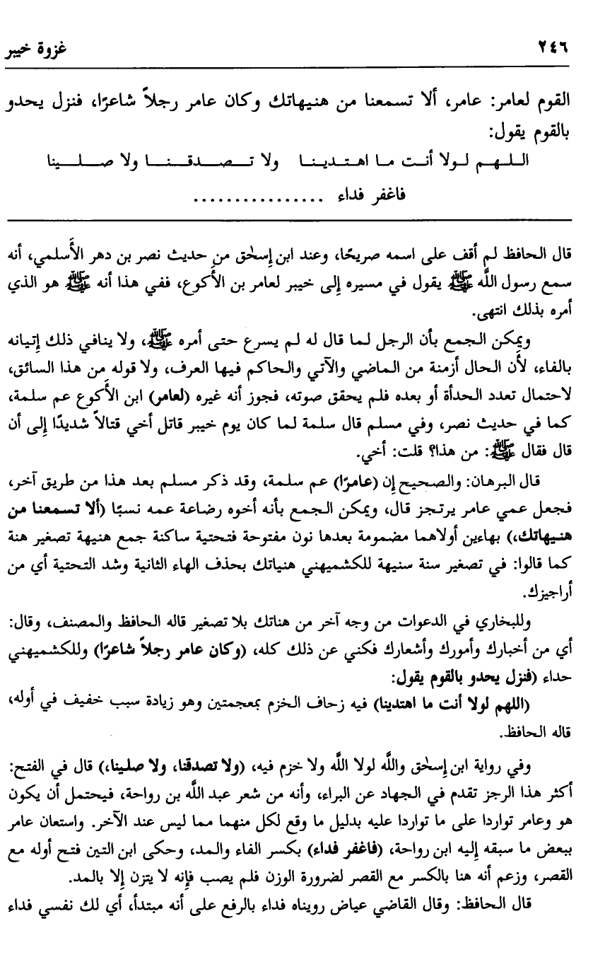 القوم لعامر: عامر، ألا تسمعنا من هنيهاتك وكان عامر رجلا شاعرا، فنزل يحدو بالقوم يقول: