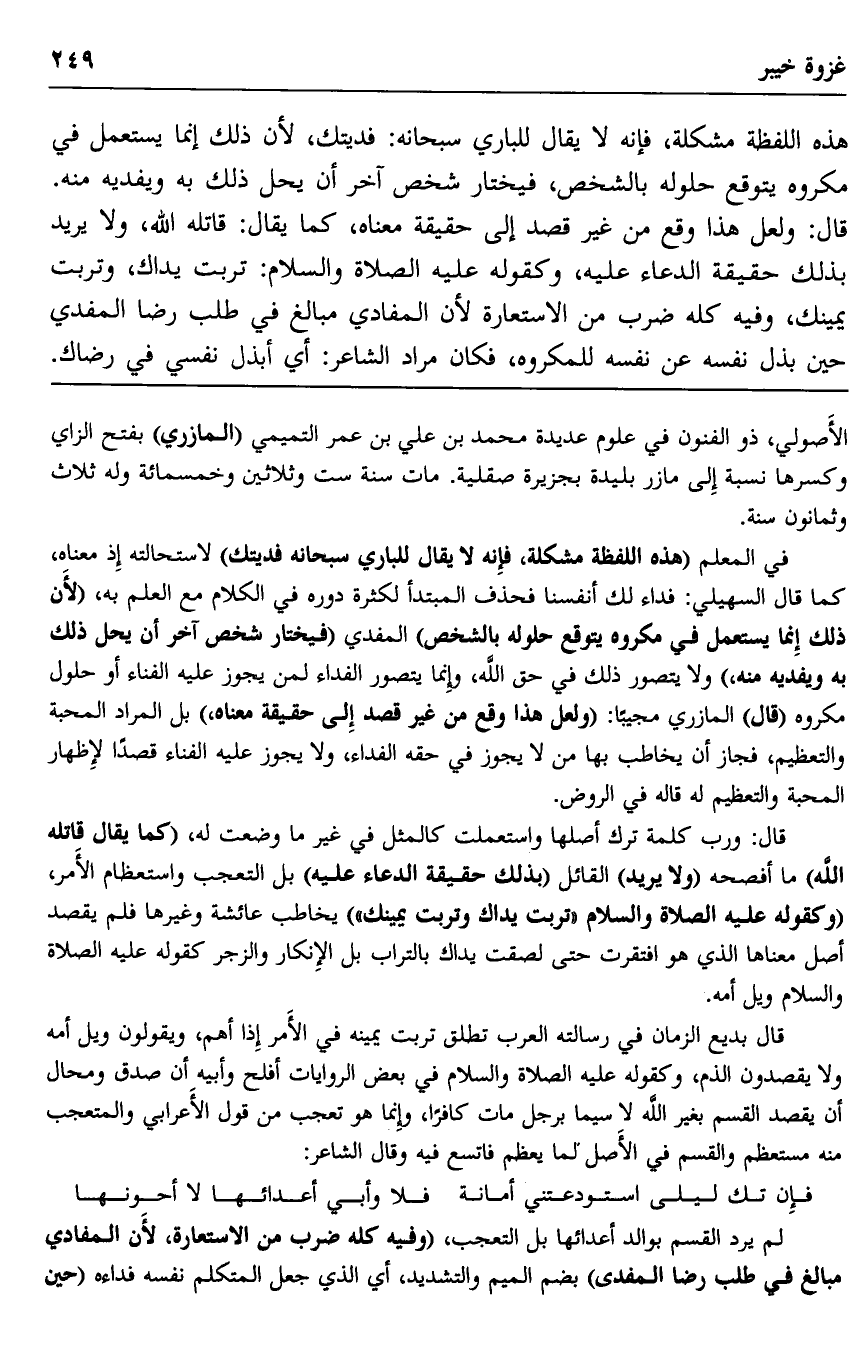 الأصولي، ذو الفنون في علوم عديدة محمد بن علي بن عمر التميمي "المازري" بفتح الزاي وكسرها نسبة إلى مازر بليدة بجزيرة صقلية. مات سنة ست وثلاثين وخمسمائة وله ثلاث وثمانون سنة.