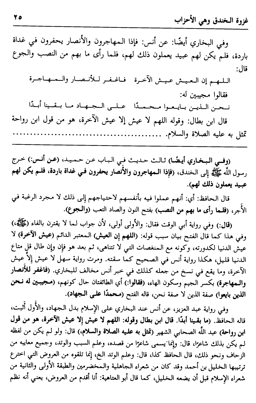 قال ابن بطال: وقوله: "اللهم لا عيش إلا عيش الآخرة"، هو من قول ابن رواحة تمثل به عليه الصلاة والسلام