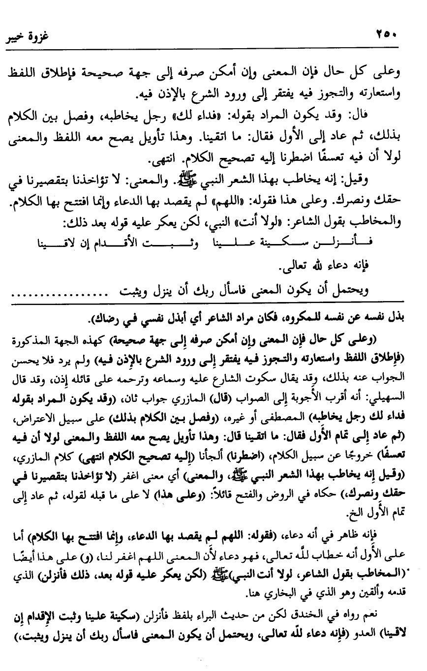 "وعلى كل حال فإن المعنى وإن أمكن صرفه إلى جهة صحيحة" كهذه الجهة المذكورة "فإطلاق اللفظ واستعارته والتجوز فيه يفتقر إلى ورود الشرع بالإذن فيه" ولم يرد فلا يحسن الجواب عنه بذلك، وقد يقال سكوت الشارع عليه وسماعه وترحمه على قائله إذن، وقد قال السهيلي: أنه أقرب الأجوبة إلى الصواب "قال" المازري جواب ثان، "وقد يكون المراد بقوله فداء لك رجل يخاطبه" المصطفى أو غيره، "وفصل بين الكلام بذلك" على سبيل الاعتراض، "ثم عاد إلى تمام الأول فقال: ما اتقينا قال: وهذا تأويل يصح معه اللفظ والمعنى لولا أن فيه تعسفا" خروجا عن سبيل الكلام، "اضطرنا" ألجأنا "إليه تصحيح الكلام انتهى" كلام المازري، "وقيل: إنه يخاطب بهذا الشعر النبي صلى الله عليه وسلم، والمعنى" أي معنى اغفر "لا تؤاخذنا بتقصيرنا في حقك ونصرك"، حكاه في الروض والفتح، قائلا: "وعلى هذا" لا على ما قبله لقوله، ثم عاد إلى تمام الأول ... إلخ.