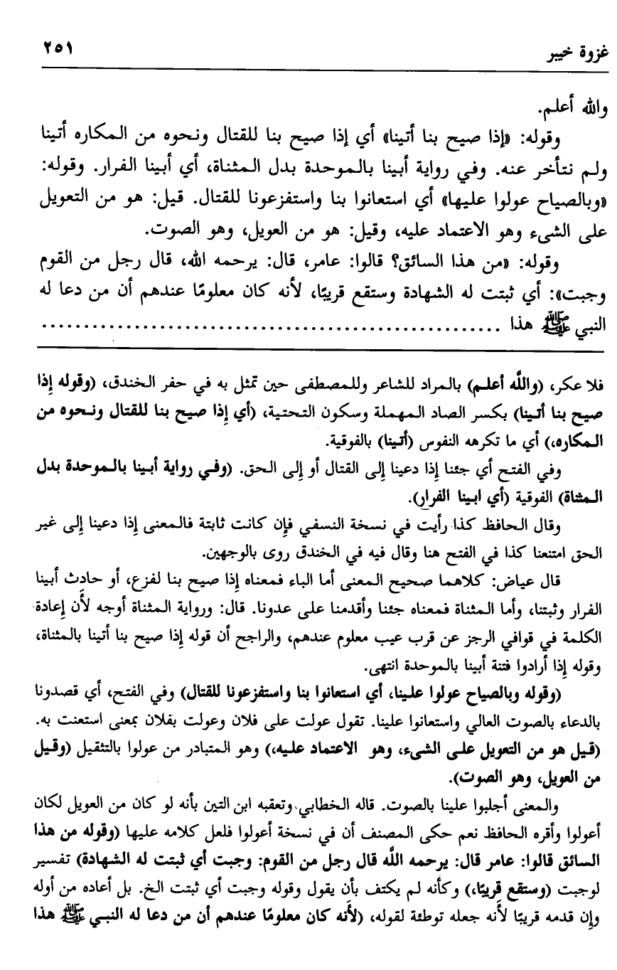 فلا عكر، "والله أعلم" بالمراد للشاعر وللمصطفى حين تمثل به في حفر الخندق، "وقوله إذا صيح بنا أتينا" بكسر الصاد المهملة وسكون التحتية، "أي إذا صيح بنا للقتال ونحوه من المكاره،" أي ما تكرهه النفوس "أتينا" بالفوقية.