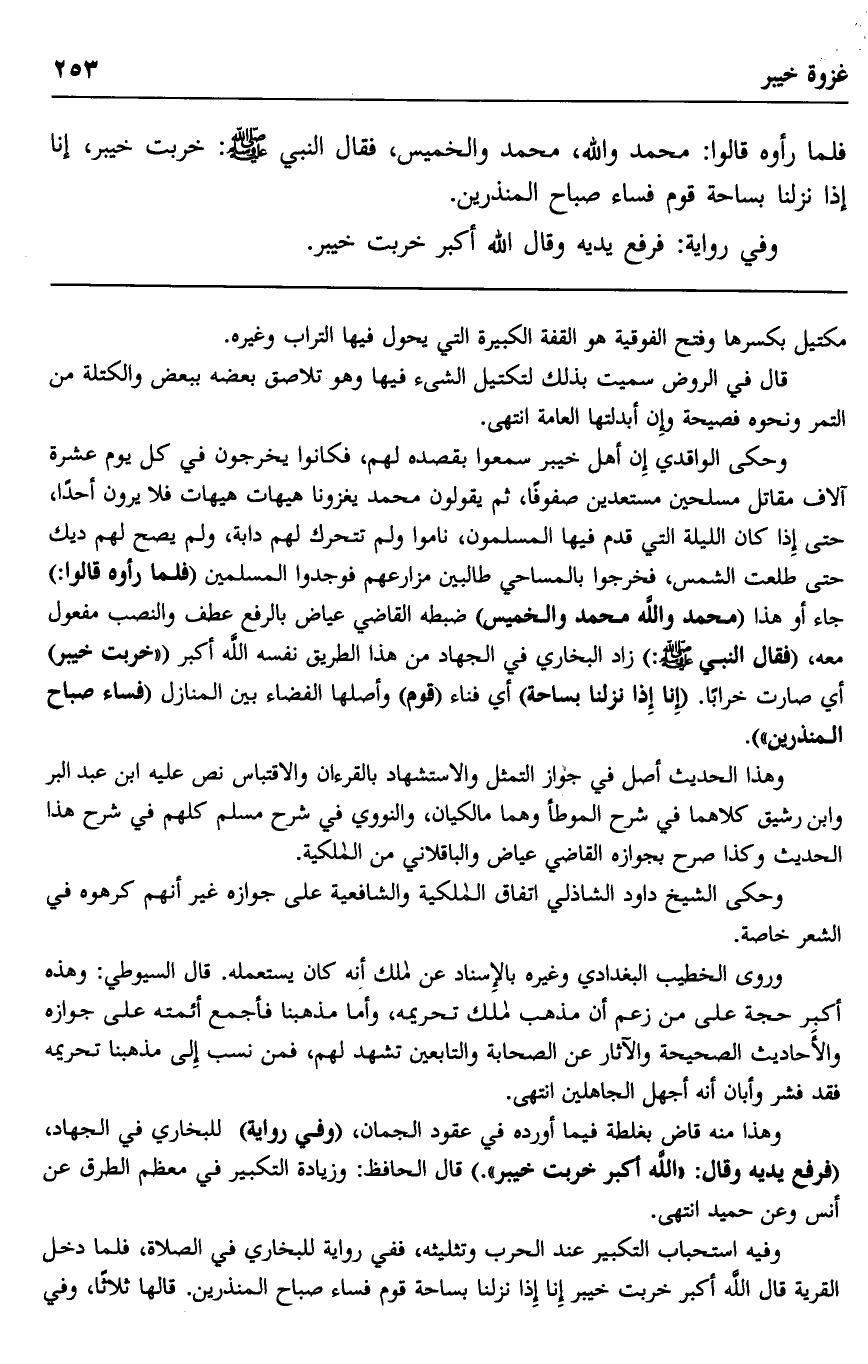 وهذا منه قاض بغلطه فيما أورده في عقود الجمان، "وفي رواية" للبخاري في الجهاد، فرفع يديه وقال: "الله أكبر خربت خيبر". قال الحافظ: وزيادة التكبير في معظم الطرق عن أنس وعن حميد. انتهى.