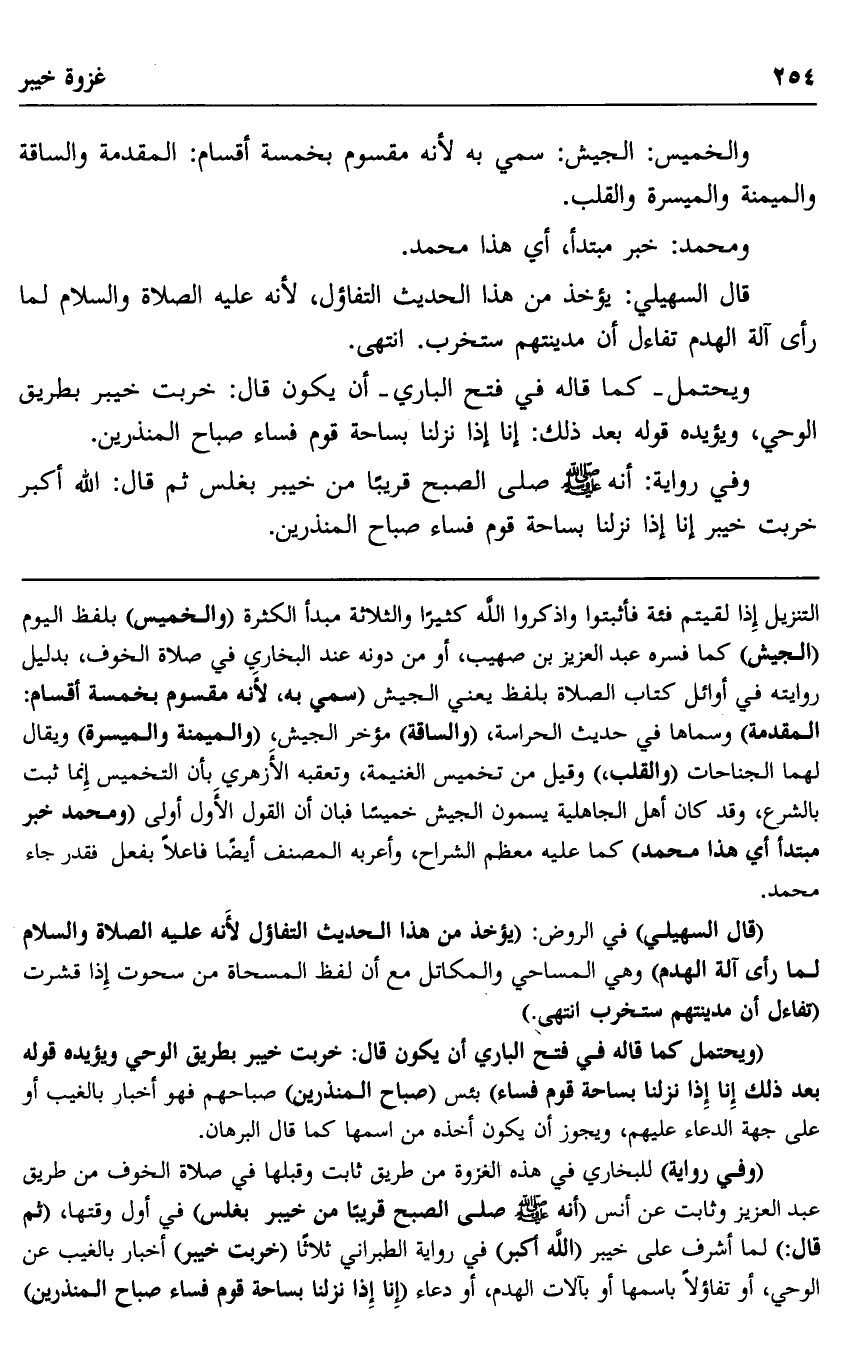 وفي رواية: أنه صلى الله عليه وسلم صلى الصبح قريبا من خيبر بغلس ثم قال: "الله أكبر خربت خيبر إنا إذا نزلنا بساحة قوم فساء صباح المنذرين".