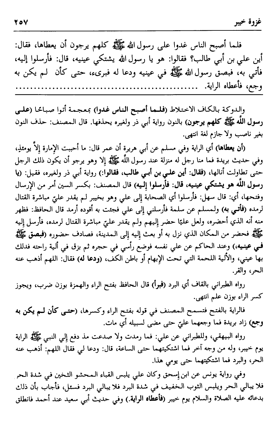 فلما أصبح الناس غدوا على رسول الله صلى الله عليه وسلم كلهم يرجون أن يعطاها، فقال: "أين علي بن أبي طالب"؟ فقالوا: هو يا رسول الله يشتكي عينيه، قال: "فأرسلوا إليه"، فأتي به، فبصق رسول الله صلى الله عليه وسلم في عينيه ودعا له فبرئ حتى كأن لم يكن به وجع، فأعطاه الراية.
