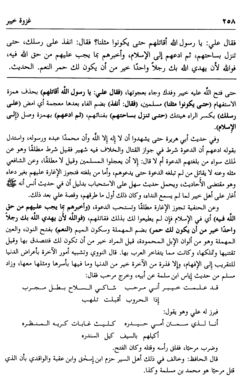 فقال علي: يا رسول الله أقاتلهم حتى يكونوا مثلنا؟ فقال: "انفذ على رسلك، حتى تنزل بساحتهم، ثم ادعهم إلى الإسلام، وأخبرهم بما يجب عليهم من حق الله فيه، فوالله لأن يهدي الله بك رجلا واحدًا خير من أن يكون لك حمر النعم". الحديث.