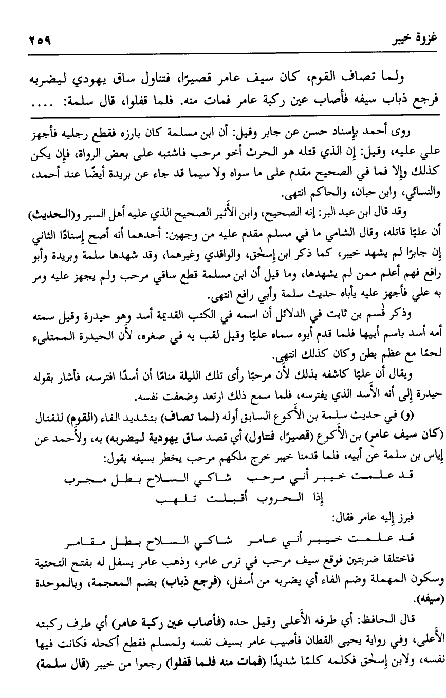 وقد قال ابن عبد البر: إنه الصحيح، وابن الأثير الصحيح الذي عليه أهل السير و"الحديث" أن عليا قاتله، وقال الشامي: ما في مسلم مقدم عليه من وجهين: أحدهما: أنه أصح إسنادا, الثاني: أن جابرا لم يشهد خيبر، كما ذكر ابن إسحاق، والواقدي, وغيرهما، وقد شهدها سلمة وبريدة وأبو رافع فهم أعلم ممن لم يشهدها، وما قيل: إن ابن مسلمة قطع ساقي مرحب ولم يجهز عليه ومر به علي فأجهز عليه يأباه حديث سلمة وأبي رافع. انتهى.