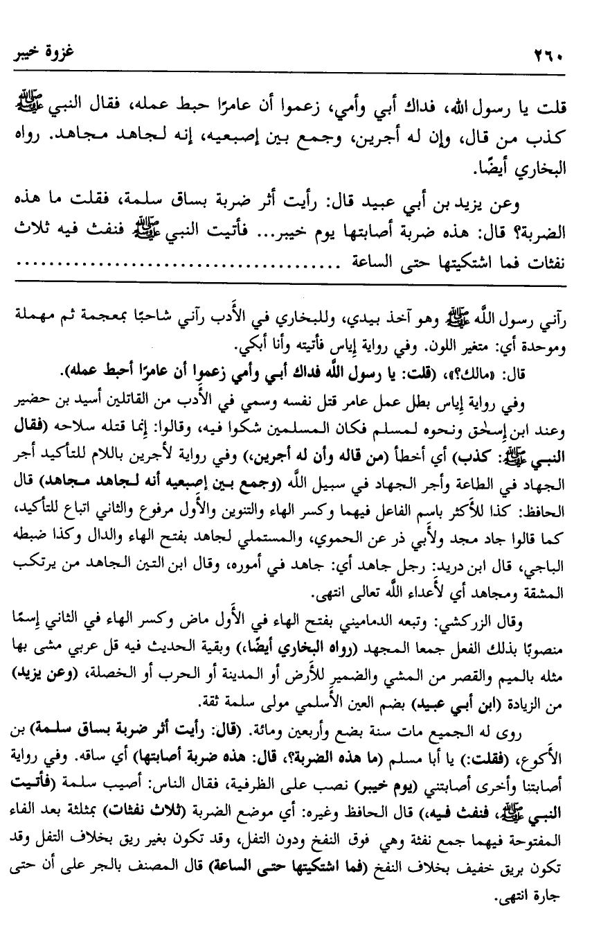 وعن يزيد بن أبي عبيد قال: رأيت أثر ضربة بساق سلمة، فقلت: ما هذه الضربة؟ قال: هذه ضربة أصابتها يوم خيبر, فأتيت النبي صلى الله عليه وسلم فنفث فيه ثلاث نفثات فما اشتكيتها حتى الساعة.