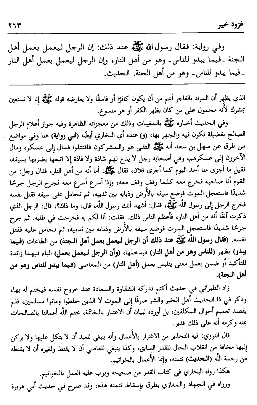 وفي الحديث أخبار صلى الله عليه وسلم بالمغيبات وذلك من معجزاته الظاهرة وفيه جواز إعلام الرجل الصالح بفضيلة تكون فيه والجهر بها، "و" عنده أي البخاري أيضا " في رواية" هنا وفي مواضع من طرق عن سهل بن سعد أنه صلى الله عليه وسلم التقى هو والمشركون فاقتتلوا فمال إلى عسكره ومال الآخرون إلى عسكرهم، وفي أصحابه رجل لا يدع لهم شاذة ولا فادة إلا اتبعها يضربها بسيفه، فقيل: ما أجزى منا أحد اليوم كما أجزى فلان، فقال صلى الله عليه وسلم: "أما إنه من أهل النار"، فقال رجل من القوم أنا صاحبه فخرج معه كلما وقف وقف معه، وإذا أسرع أسرع معه فجرح الرجل جرحا شديدا فاستعجل الموت فوضع سيفه بالأرض وذبابه بين ثدييه، ثم تحامل على سيفه فقتل نفسه فخرج الرجل إلى رسول الله صلى الله عليه وسلم فقال: أشهد أنك رسول الله، قال: "وما ذاك"؟ قال: الرجل الذي ذكرت آنفا أنه من أهل النار، فأعظم الناس ذلك. فقلت: أنا لكم به فخرجت في طلبه, ثم جرح جرحا شديدا فاستعجل المو فوضع سيفه بالأرض وذبابه بين ثدييه، ثم تحامل عليه فقتل نفسه. فقال رسول الله صلى الله عليه وسلم عند ذلك: "إن الرجل ليعمل بعمل أهل الجنة" من الطاعات "فيما يبدو" يظهر "للناس وهو من أهل النار" فيدخلها "وأن الرجل ليعمل بعمل" الباء فيهما زائدة للتأكيد أو ضمن يعمل معنى يتلبس بعمل "أهل النار" من المعاصي "فيما يبدو للناس وهو من أهل الجنة".