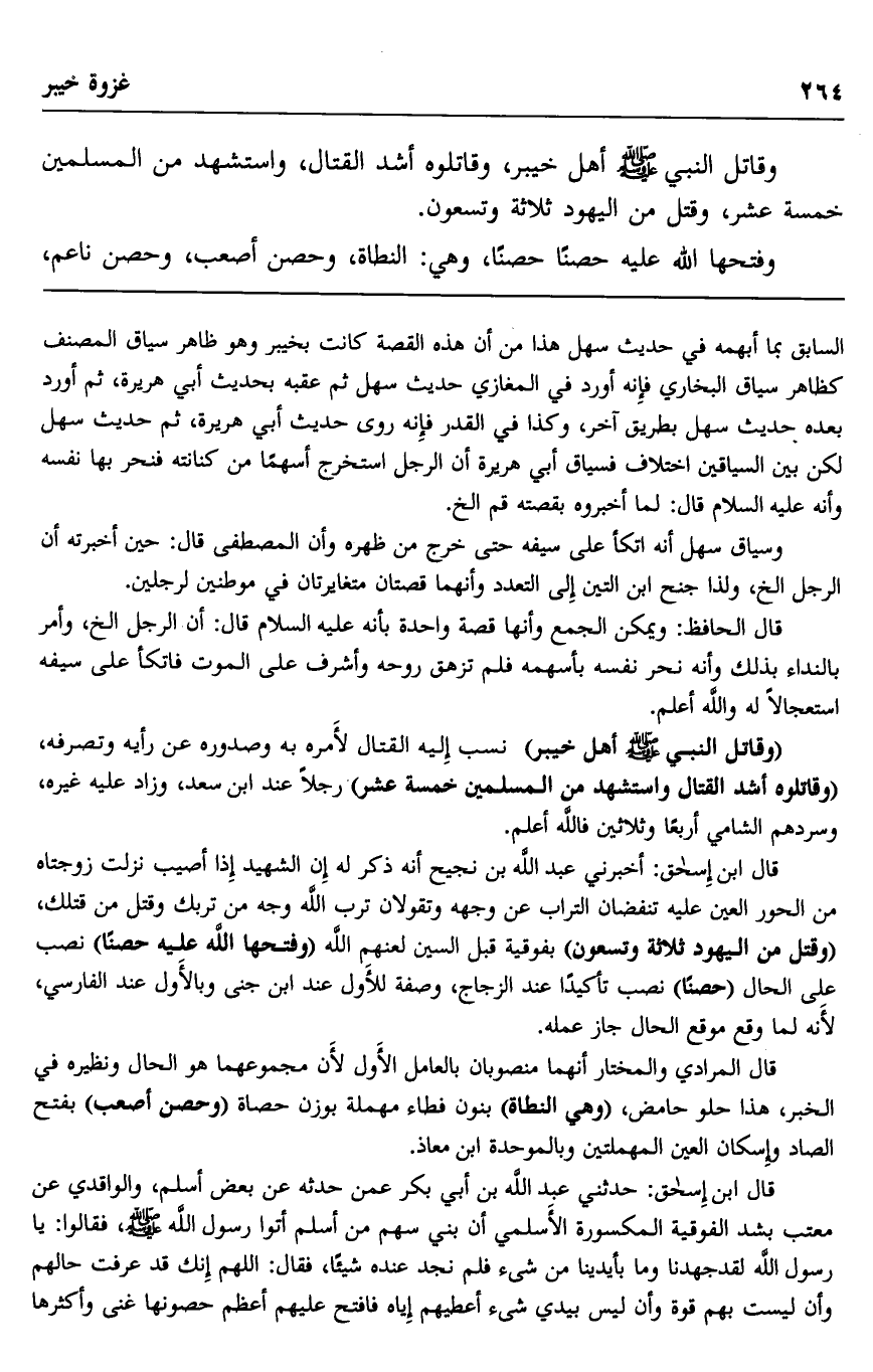 وقاتل النبي صلى الله عليه وسلم أهل خيبر، وقاتلوه أشد القتال، واستشهد من المسلمين خمسة عشر، وقتل من اليهود ثلاثة وتسعون.
