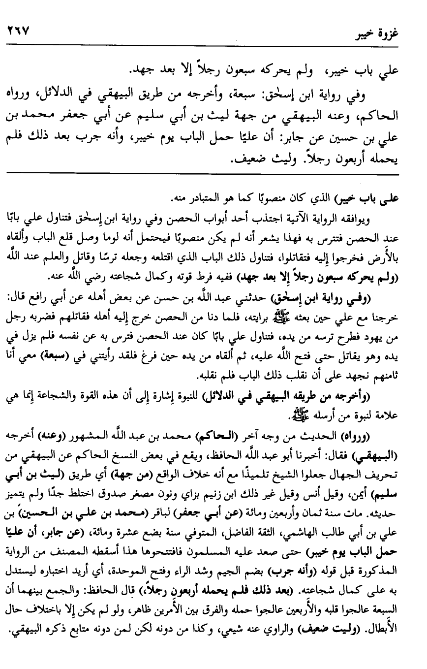 وفي رواية ابن إسحاق: سبعة، وأخرجه من طريق البيهقي في الدلائل، ورواه الحاكم، وعنه البيهقي من جهة ليث بن أبي سليم، عن أبي جعفر محمد بن علي بن حسين عن جابر: أن عليا حمل الباب يوم خيبر، وأنه جرب بعد ذلك فلم يحمله أربعون رجلا, وليث ضعيف.