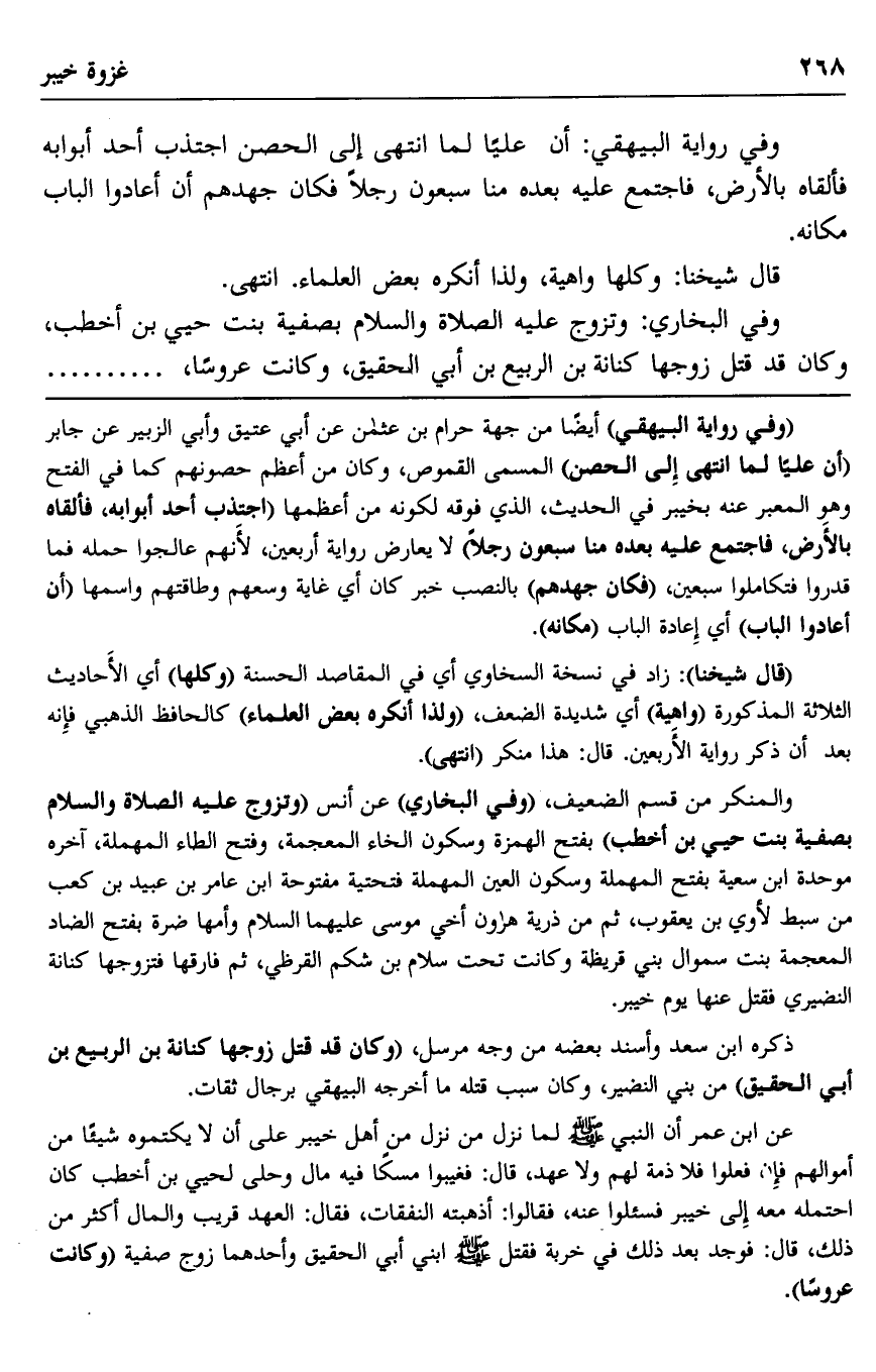 والمنكر من قسم الضعيف، "وفي البخاري" عن أنس "وتزوج عليه الصلاة والسلام بصفية بنت حيي بن أخطب" بفتح الهمزة وسكون الخاء المعجمة، وفتح الطاء المهملة، آخره موحدة ابن سعية بفتح المهملة وسكون العين المهملة فتحتية مفتوحة ابن عامر بن عبيد بن كعب من سبط لاوي بن يعقوب، ثم من ذرية هارون أخي موسى عليهما السلام, وأمها ضرة بفتح الضاد المعجمة بنت سموال بني قريظة وكانت تحت سلام بن شكم القرظي، ثم فارقها فتزوجها كنانة النضيري فقتل عنها يوم خيبر.