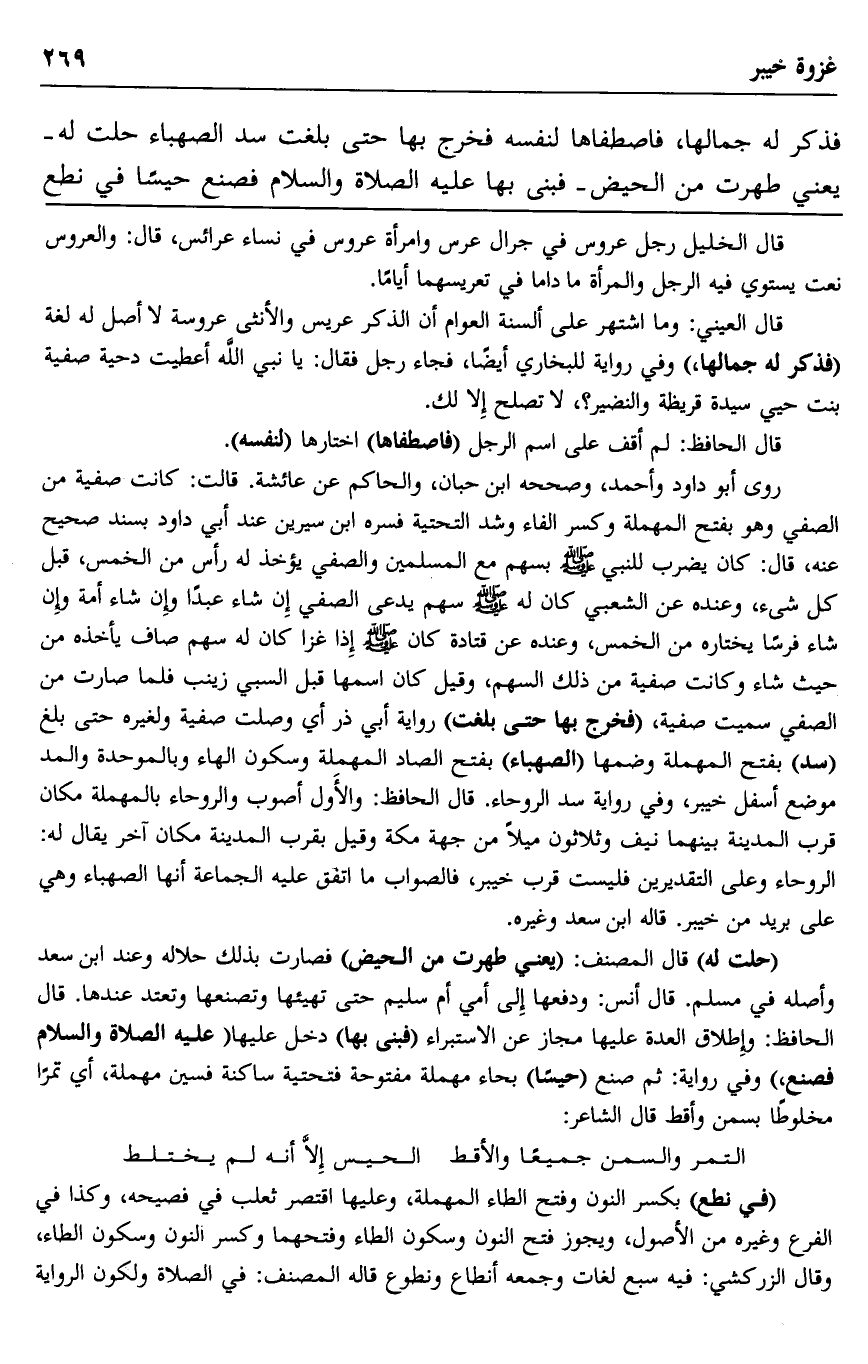 روى أبو داود وأحمد، وصححه ابن حبان، والحاكم عن عائشة، قالت: كانت صفية من الصفي وهو بفتح المهملة وكسر الفاء وشد التحتية فسره ابن سيرين عند أبي داود بسند صحيح عنه، قال: كان يضرب للنبي صلى الله عليه وسلم بسهم مع المسلمين والصفي يؤخذ له رأس من الخمس، قبل كل شيء، وعنده عن الشعبي كان له صلى الله عليه وسلم سهم يدعى الصفي إن شاء عبدا وإن شاء أمة وإن شاء فرسا يختاره من الخمس، وعنده عن قتادة كان صلى الله عليه وسلم إذا غزا كان له سهم صاف يأخذه من حيث شاء وكانت صفية من ذلك السهم، وقيل: كان اسمها قبل السبي زينب فلما صارت من الصفي سميت صفية، "فخرج بها حتى بلغت". رواية أبي ذر: أي وصلت صفية, ولغيره: حتى بلغ "سد" بفتح المهملة وضمها "الصهباء" بفتح الصاد المهملة وسكون الهاء وبالموحدة والمد موضع أسفل خيبر، وفي رواية سد الروحاء. قال الحافظ: والأول أصوب والروحاء بالمهملة مكان قرب المينة بينهما نيف وثلاثون ميلا من جهة مكة وقيل: بقرب المدينة مكان آخر يقال له: الروحاء وعلى التقديرين فليست قرب خيبر، فالصواب ما اتفق عليه الجماعة أنها الصهباء وهي على بريد من خيبر. قاله ابن سعد وغيره.