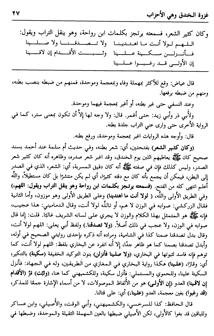 "وكان كثير الشعر" بفتحتين، أي: شعر بطنه، وفي حديث أم سلمة عند أحمد بسند صحيح كان صلى الله عليه وسلم يعاطيهم اللبن يوم الخندق، وقد أغبر شعر صدره، وظاهره أنه كان كثير شعر الصدر، وليس كذلك فإن في صفته صلى الله عليه وسلم أنه كان دقيق المسربة، أي: الشعر، الذي في الصدر إلى البط، فيمكن أن يجمع بأنه كان مع دقته كثيرا، أي: لم يكن منتشرا بل كان مستطيلا، والله أعلم انتهى كله من الفتح. "فسمعته يرتجز بكلمات ابن رواحة وهو ينقل التراب ويقول: اللهم" وفي الطريق الأولى والله، "لولا أنت ما اهتدينا" وعلى الطريق الأولى وهو موزون، وأما الثانية فقال الزركشي: صوابه في الوزن لا هم، أو تالله لولا أنت، قال الدماميني: هذا عجيب، فإنه صلى الله عليه وسلم هو المتمثل بهذا الكلام والوزن لا يجري على لسانه الشريف غالبا. قلت: إنما قال صوابه في الوزن، ولا عجب في ذلك أصلا. "ولا تصدقنا" ولفظ أبي يعلى: اللهم لولا أنت، وقال بدل تصدقنا صمنا كذا في الشامية، ومراده أنه ذكره بإحدى روايتي الصحيح في أوله، وأبدل تصدقنا بصمنا كما هو ظاهر جدا، إلا أنه انفرد عن البخاري بلفظ: اللهم لولا أنت، كما توهم فإنه فاسد لثبوتها في البخاري "ولا صلينا فأنزلن" بنون التوكيد الخفيفة "سكينة" بالتنكير، أي: وقارا، "علينا" هكذا رواية البخاري في المغازي من الطريقين، وله في الجهاد: فأنزل السكينة علينا، وللحموي والمستملي: فأنزل سكينة، وللكشميهني كما هنا، "وثبت" قوّ "الأقدام إن لاقينا" العدو "إن الأولى" هو من الألفاظ الموصولات، لا من أسماء الإشارة جمعا للمذكر، "قد رغبوا" بغين معجمة، العدو "علينا" أي: على قتالنا.