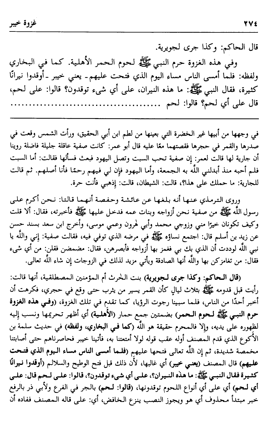 "قال الحاكم: وكذا جرى لجويرية" بنت الحارث أم المؤمنين المصطلقية، أنها قالت: رأيت قبل قدومه صلى الله عليه وسلم بثلاث ليال كأن القمر يسير من يثرب حتى وقع في حجري، فكرهت أن أخبر أحدًا من الناس، فلما سبينا رجوت الرؤيا، كما تقدم في تلك الغزوة، "وفي هذه الغزوة حرم النبي صلى الله عليه وسلم لحوم الحمر" بضمتين جمع حمار "الأهلية" أي أظهر تحريمها ونسب إليه لظهوره على يديه، وإلا فالمحرم حقيقة هو الله "كما في البخاري، ولفظه" في حديث سلمة بن الأكوع الذي قدم المصنف أوله عقب قوله: لولا أمتعتنا، فأتينا خيبر فحاصرناهم حتى أصابتنا مخمصة شديدة، ثم إن الله تعالى فتحها عليهم "فلما أمسى الناس مساء اليوم الذي فتحت عليهم" قال المصنف "يعني خيبر" أي غالبها، لأن ذلك قبل فتح الوطيح والسلالم, أوقدوا نيرانا كثيرة فقال النبي صلى الله عليه وسلم: "ما هذه النيران؟ على أي شيء توقدون"؟. قالوا: على لحم. قال: "على أي لحم"؟ أي: على أي أنواع اللحم توقدونها، "قالوا: لحم" بالجر في الفرع ولأبي ذر بالرفع خبر مبتدأ محذوف أي هو ويجوز النصب بنزع الخافض، أي: على قاله المصنف ففاده أن